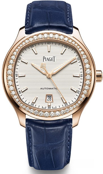 Часы Piaget Polo 41 mm представлены в корпусе из розового золота 18к размером 41 мм и водонепроницаемостью 50 м. Внутри корпуса установлен автоматический механизм, Калибр Piaget 1110P, обладающий запасом хода 50 часов. На белом гильошированном циферблате отображаются часы, минуты, секунды и дата. Часы комплектуются ремешком из кожи аллигатора с вставкой из розового золота 18к. Безель из белых бриллиантов.