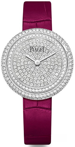 Часы Piaget Possession представлены в корпусе из белого золота 18к размером 34 мм и водонепроницаемостью 30 м. Внутри корпуса установлен кварцевый механизм, Калибр Piaget 56P. На циферблате из белых бриллиантов отображаются часы, минуты. Часы комплектуются ремешком из кожи аллигатора с вставкой из белого золота 18к. Безель из белых бриллиантов.
