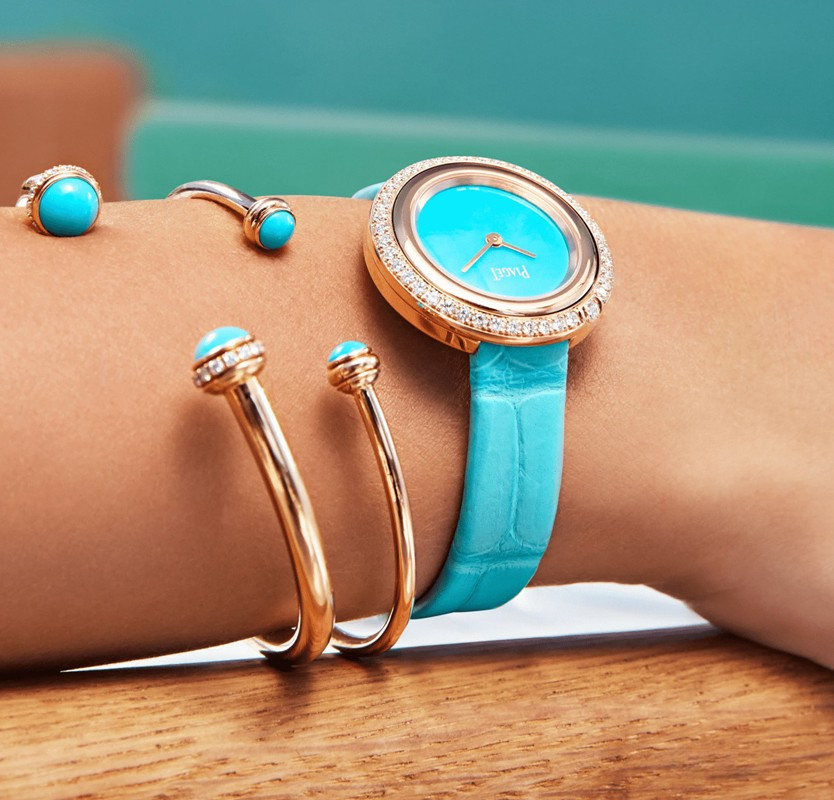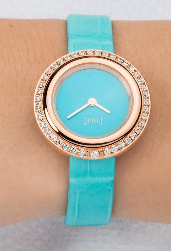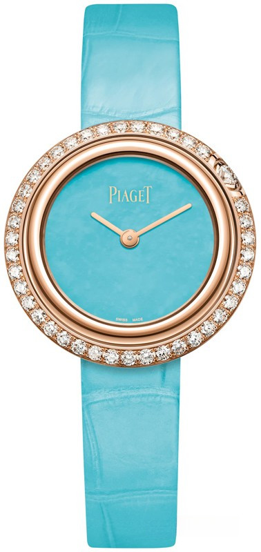 Часы Piaget Possession представлены в корпусе из розового золота 18к размером 29 мм и водонепроницаемостью 30 м. Внутри корпуса установлен кварцевый механизм, Калибр Piaget 56P. На голубом циферблате отображаются часы, минуты. Часы комплектуются ремешком из кожи аллигатора с вставкой из розового золота 18к. Безель из белых бриллиантов.