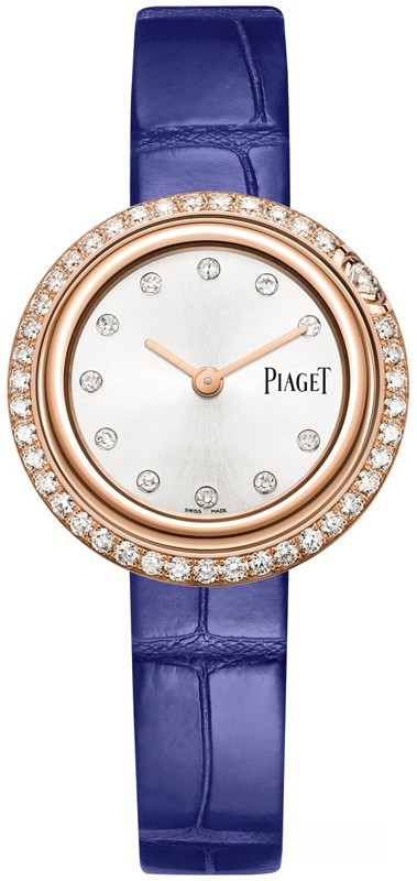Часы Piaget Possession представлены в корпусе из розового золота 18к размером 29 мм и водонепроницаемостью 30 м. Внутри корпуса установлен кварцевый механизм, Калибр Piaget 56P. На серебристом циферблате с 11-ю белыми бриллиантами отображаются часы, минуты. Часы комплектуются ремешком из кожи аллигатора с вставкой из розового золота 18к. Безель из белых бриллиантов.