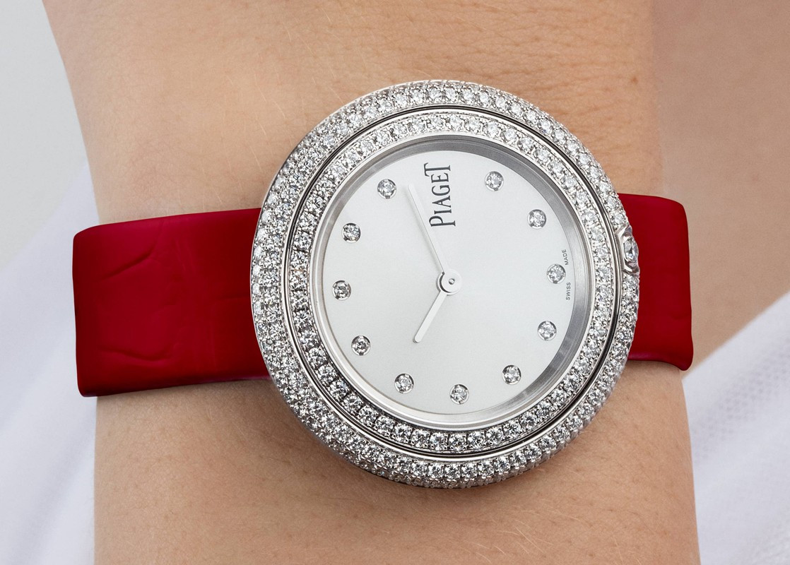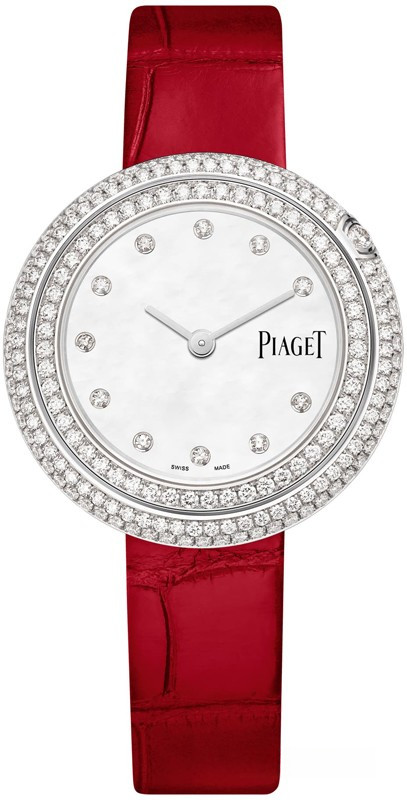 Часы Piaget Possession представлены в корпусе из белого золота 18к размером 34 мм и водонепроницаемостью 30 м. Внутри корпуса установлен кварцевый механизм, Калибр Piaget 56P. На белом жемчужном циферблате с 11-ю белыми бриллиантами отображаются часы, минуты. Часы комплектуются ремешком из кожи аллигатора с вставкой из белого золота 18к. Безель из белых бриллиантов.
