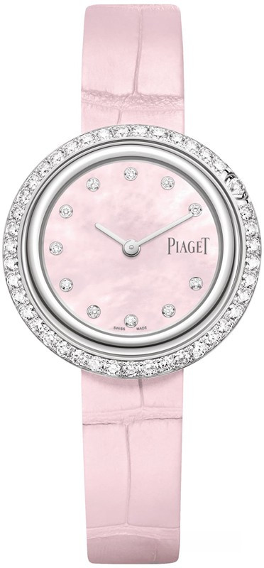 Часы Piaget Possession представлены в корпусе из белого золота 18к размером 29 мм и водонепроницаемостью 30 м. Внутри корпуса установлен кварцевый механизм, Калибр Piaget 56P. На розовом жемчужном циферблате с 11-ю белыми бриллиантами отображаются часы, минуты. Часы комплектуются ремешком из кожи аллигатора с вставкой из белого золота 18к. Безель из белых бриллиантов.