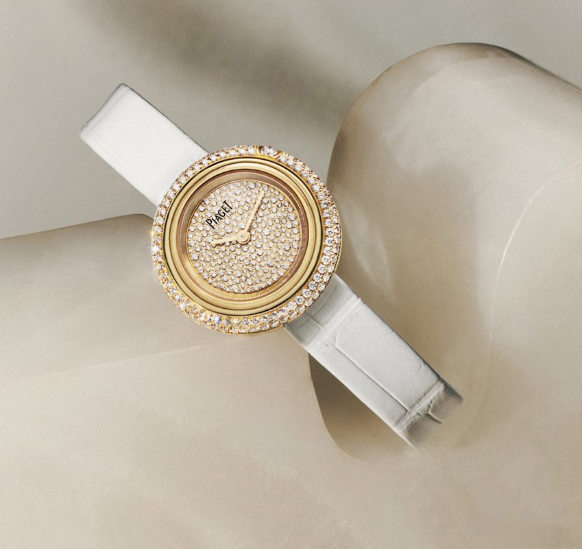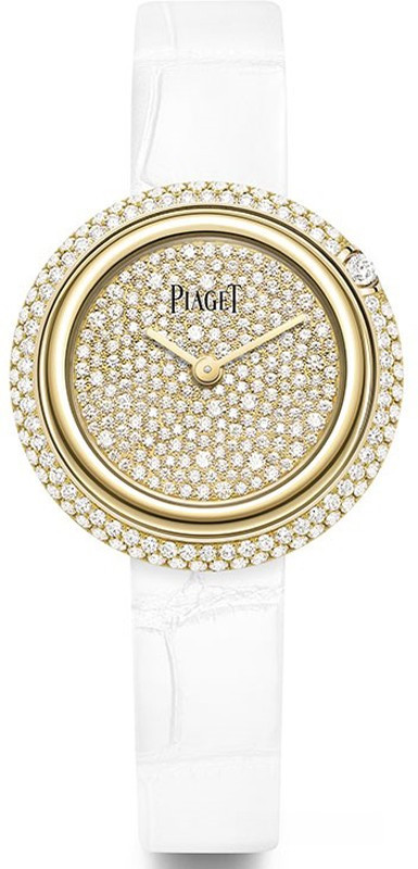 Часы Piaget Possession представлены в корпусе из желтого золота 18к размером 29 мм и водонепроницаемостью 30 м. Внутри корпуса установлен кварцевый механизм, Калибр Piaget 56P. На циферблате с белыми бриллиантами отображаются часы, минуты. Часы комплектуются ремешком из кожи аллигатора с вставкой из желтого золота 18к. Безель из белых бриллиантов.