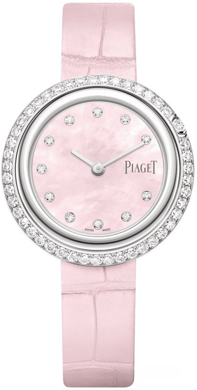 Часы Piaget Possession представлены в корпусе из белого золота 18к размером 34 мм и водонепроницаемостью 30 м. Внутри корпуса установлен кварцевый механизм, Калибр Piaget 56P. На розовом жемчужном циферблате с 11-ю белыми бриллиантами отображаются часы, минуты. Часы комплектуются ремешком из кожи аллигатора с вставкой из белого золота 18к. Безель из белых бриллиантов.