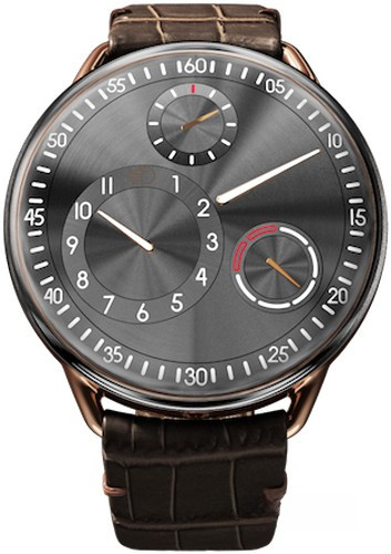 Часы Ressence Type 1 представлены в корпусе из розового золота 18к размером 42 х 13 мм и водонепроницаемостью 10 метров. Внутри корпуса установлен автоматический механизм, Калибр 2824/2 с запасом хода 36 часов. На сером циферблате отображаются часы, минуты, секунды, день недели. Часы комплектуются ремешком из кожи аллигатора с титановой вставкой.