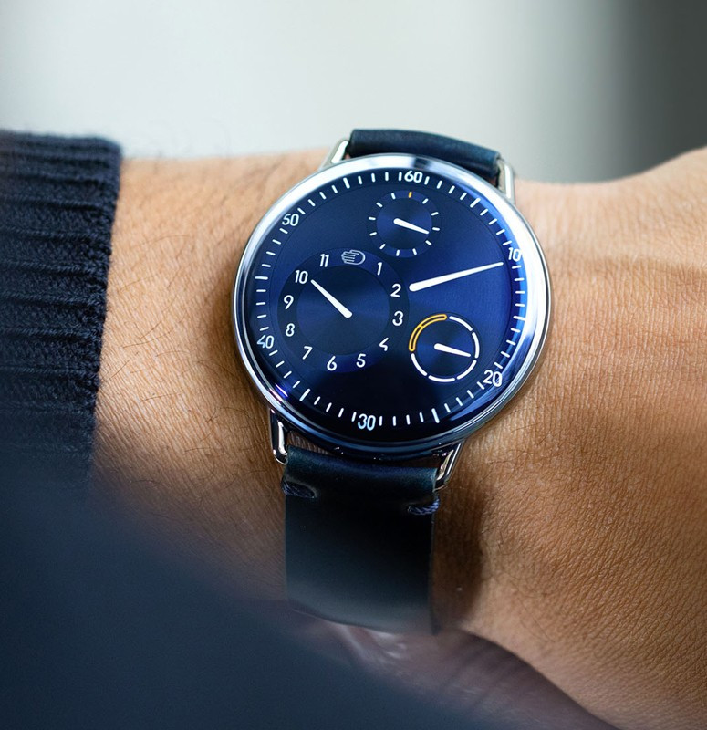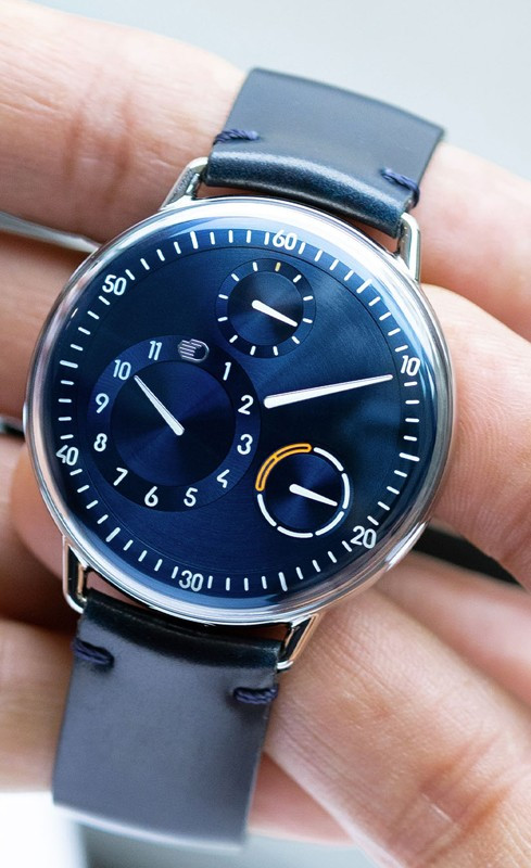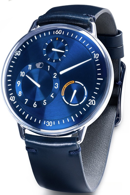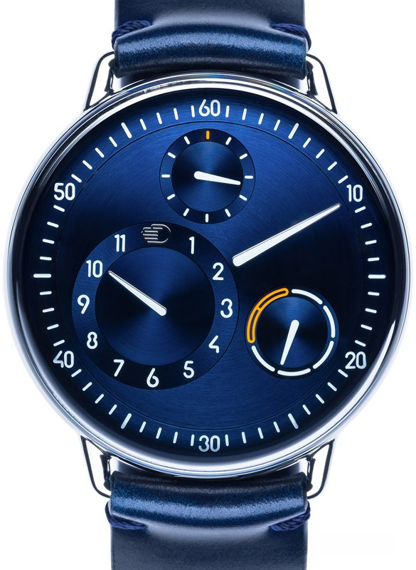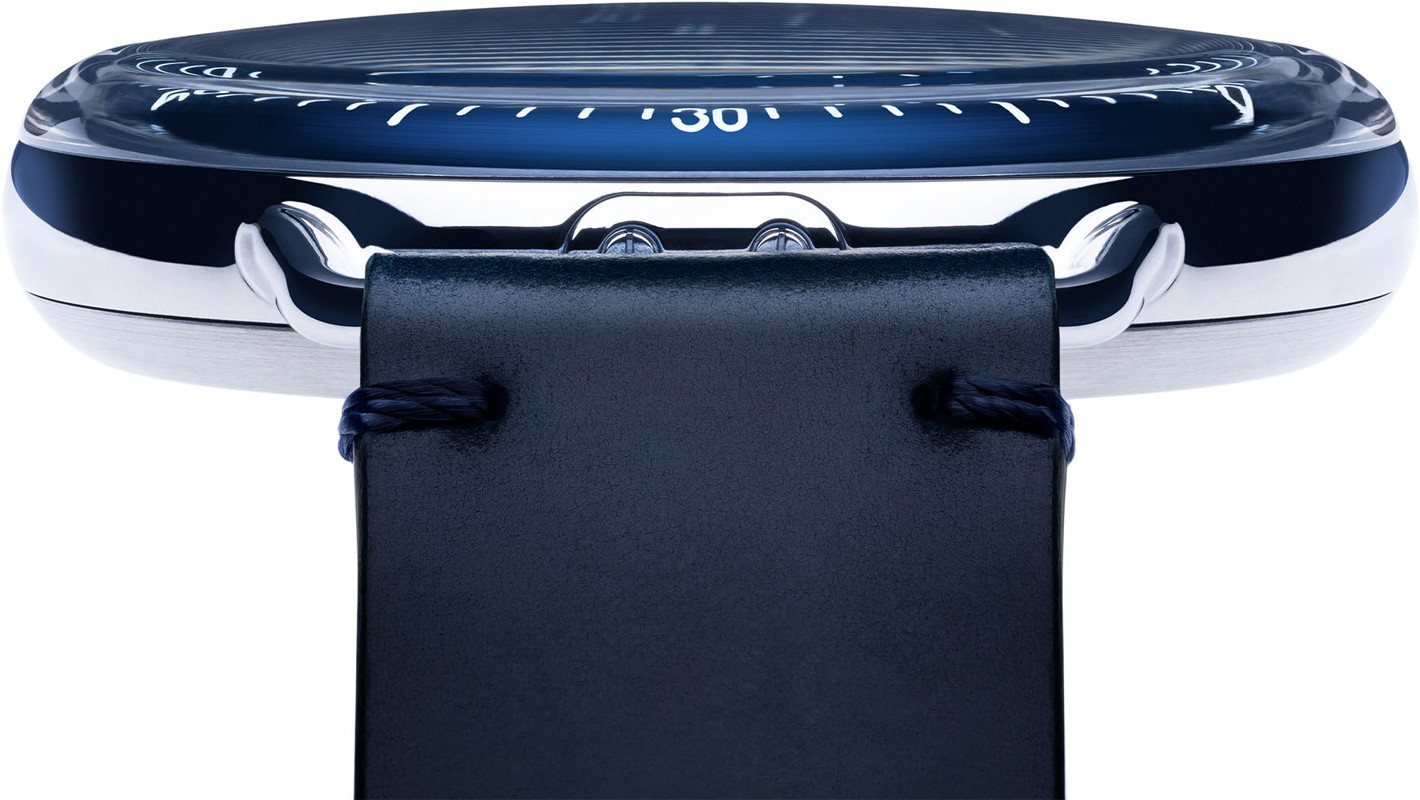 Часы Ressence Type 1 Round представлены в корпусе из титана размером 42.7 х 11 мм и водонепроницаемостью 10 метров. Внутри корпуса установлен автоматический механизм с запасом хода 36 часов. На синем циферблате отображаются часы, минуты, секунды, запас хода. Часы комплектуются кожаным ремешком с титановой застежкой.