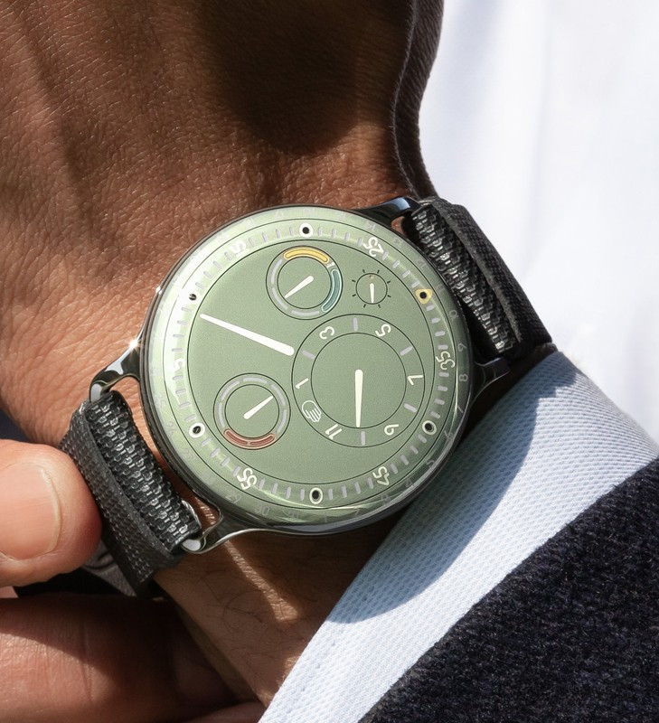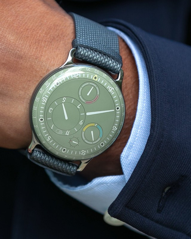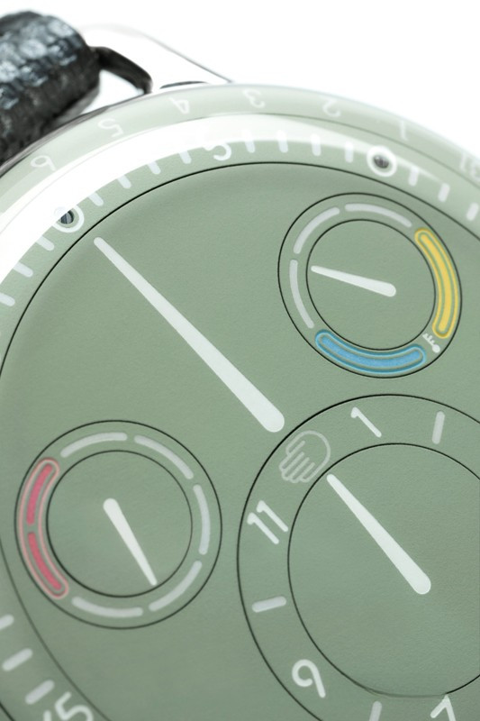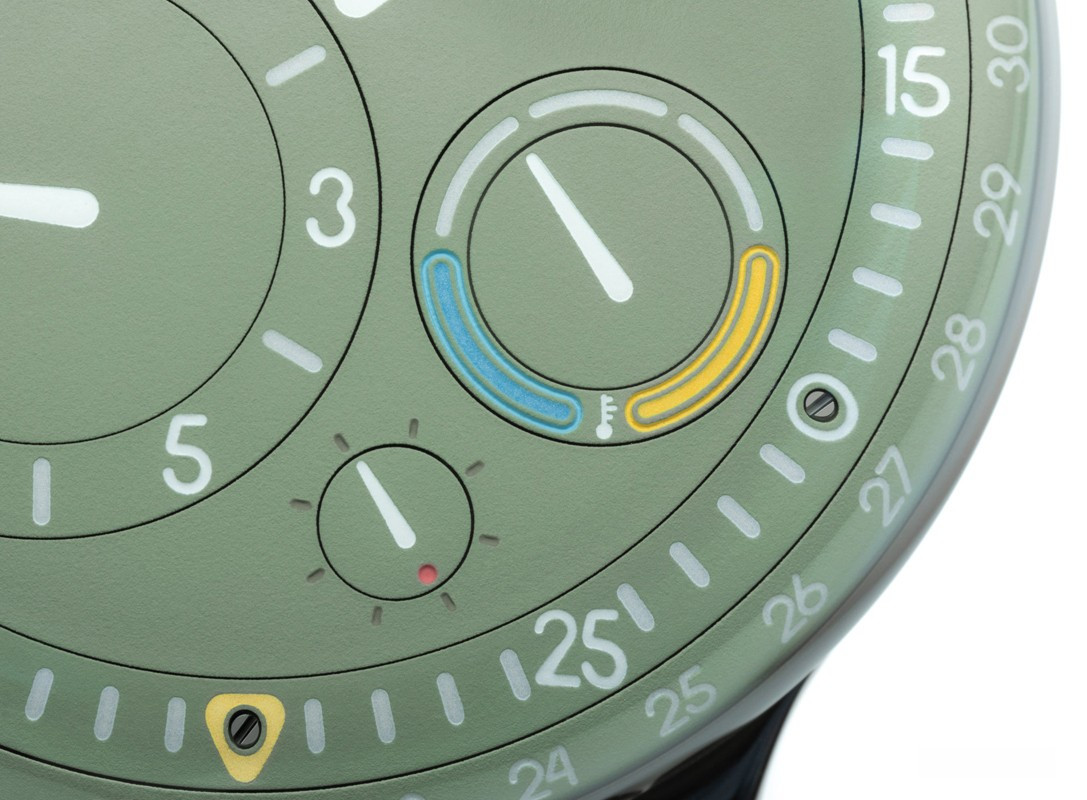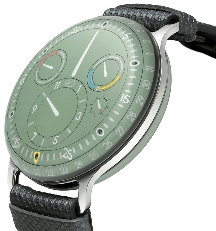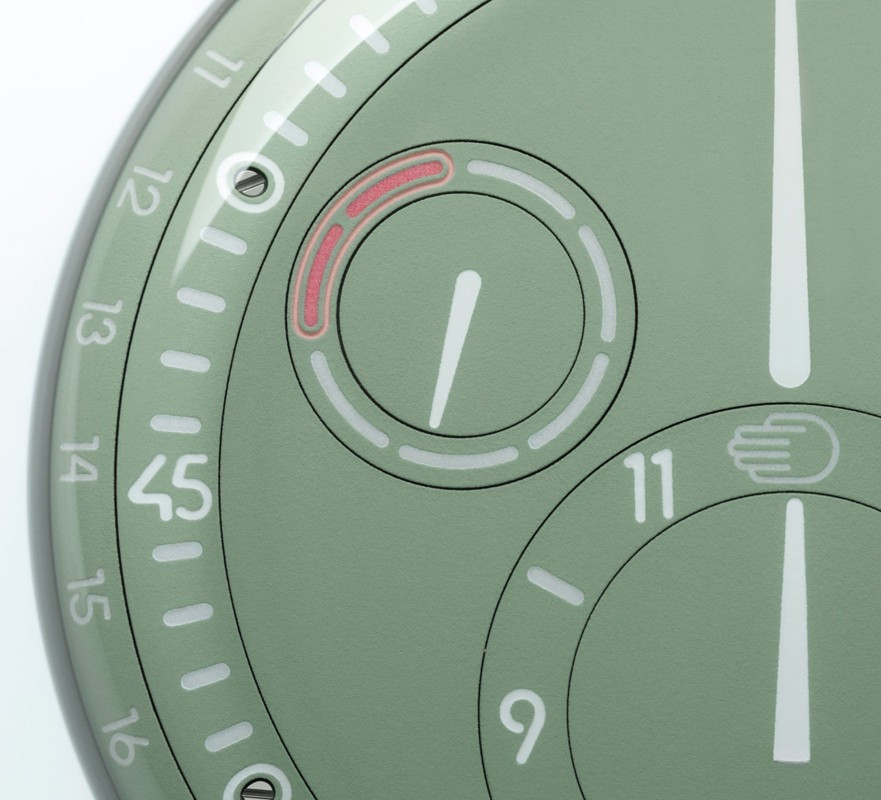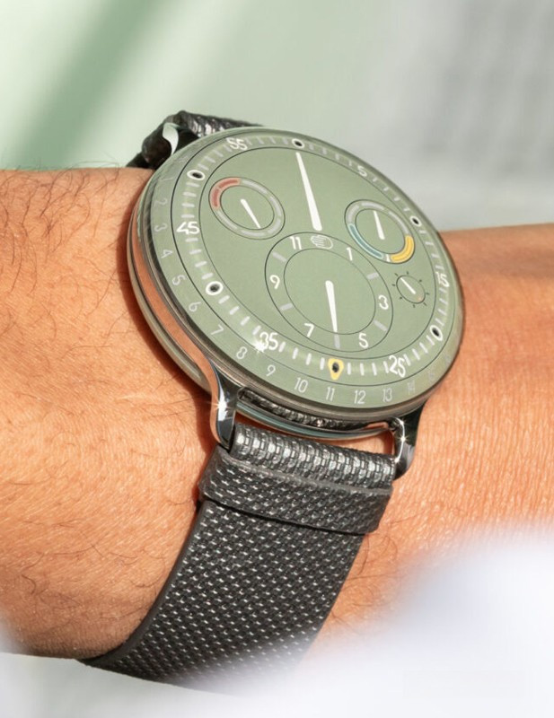 Часы Ressence Type 3 представлены в титановом корпусе размером 44 х 15 мм и водонепроницаемостью 30 метров. Внутри корпуса установлен автоматический механизм, Калибр 2824/2 с запасом хода 36 часов. На зеленом циферблате отображаются часы, минуты, секунды, дата, день недели, датчик температуры масла. Часы комплектуются кожаным ремешком с титановой застежкой.