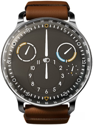 Часы Ressence Type 3 представлены в титановом корпусе размером 44 х 15 мм и водонепроницаемостью 30 метров. Внутри корпуса установлен автоматический механизм, Калибр 2824/2 с запасом хода 36 часов. На сером циферблате отображаются часы, минуты, секунды, дата, день недели, датчик температуры масла. Часы комплектуются кожаным ремешком с титановой вставкой.