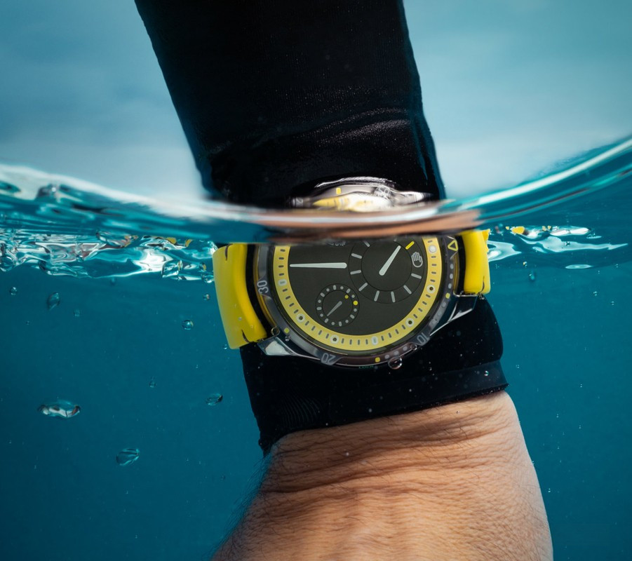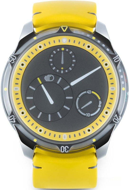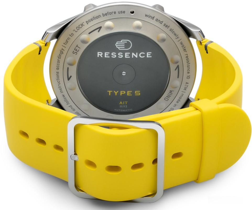 Часы Ressence Type 5 представлены в титановом корпусе размером 46 х 15.5 мм и водонепроницаемостью 100 метров. Внутри корпуса установлен автоматический механизм, Калибр 2824/2 с запасом хода 36 часов. На сером циферблате отображаются часы, минуты, секунды, датчик температуры масла. Часы комплектуются каучуковым ремешком с титановой застежкой. Безель часов вращается. Серия ограничена - 12 шт.