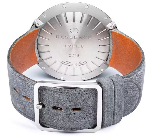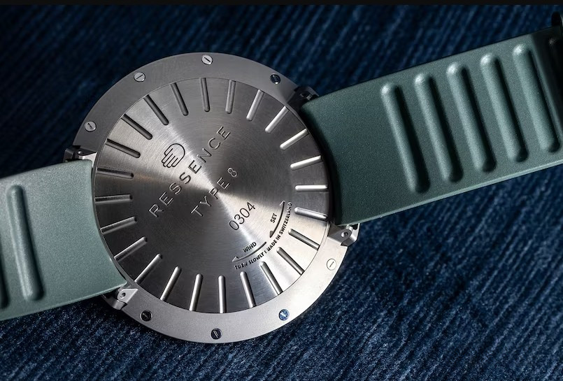 Часы Ressence Type 8 представлены в корпусе из титана размером 42.9 x 11 мм водонепроницаемостью 30 метров. Внутри корпуса установлен автоматический механизм, Калибр 2894/2, обладающий запасом хода 36 часов. На зеленом циферблате отображаются часы, минуты. Часы комплектуются кожаным ремешком с титановой застежкой.