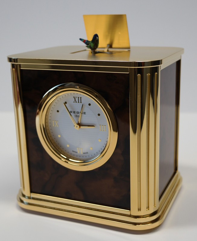 Музыкальные швейцаркие часы Reuge 1865 Francastel Singing Bird. Reuge 1865 - на сегодняшний день самый известный в мире производитель музыкальных шкатулок премиум-класса. Каждая модель, которая выходит под этой маркой, поистине эксклюзивны. Francastel Singing Bird - роскошный подарок для себя и близких вам людей. Настольные механические часы с будильником и 8-дневным запасом хода украшены поющей птичкой. В момент включения будильника птичка выходит из гнезда, взмахивает крыльями, шевелит головой и хвостом в такт пению. Размеры: 147 х 124 х 145 мм. Функции: часы, минуты, будильник, мелодия, повтор. Корпус: позолота, ореховое дерево. Механизм с ручным заводом, запас хода 8 дней. Калибр: AXT.92.6179.102.