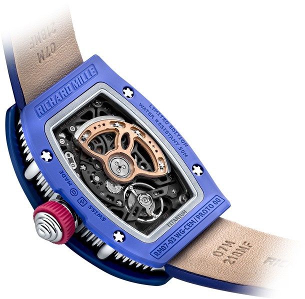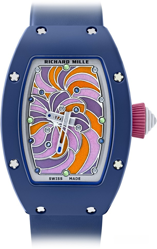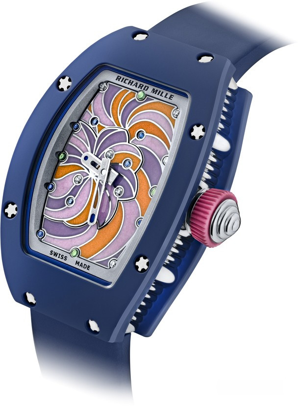 Часы Richard Mille Bonbon представлены в корпусе из керамики и белого золота 18к размером 45.32 x 32.3 х 11.93 мм и водонепроницаемостью 50 м. Внутри корпуса установлен автоматический механизм, Калибр CRMA2, обладающий запасом хода 50 часов. На разноцветном циферблате с белыми бриллиантами, темно-синим сапфиром, цаворитами отображаются часы, минуты. Часы комплектуются каучуковым ремешком с титановой вставкой. Серия ограничена - 30 шт.