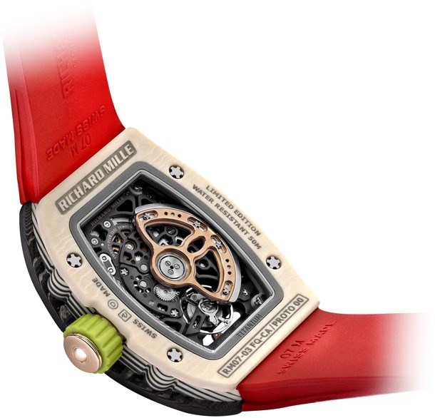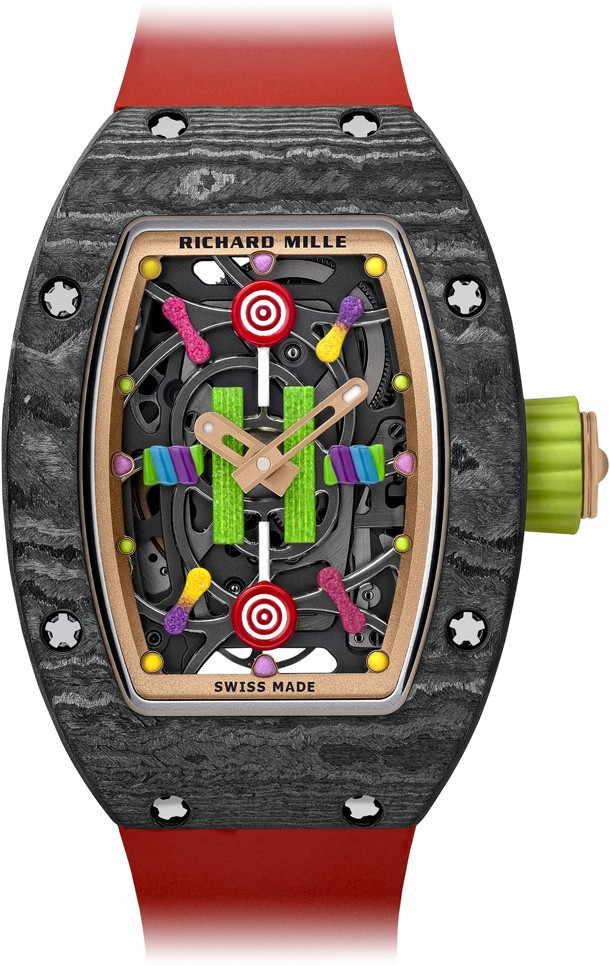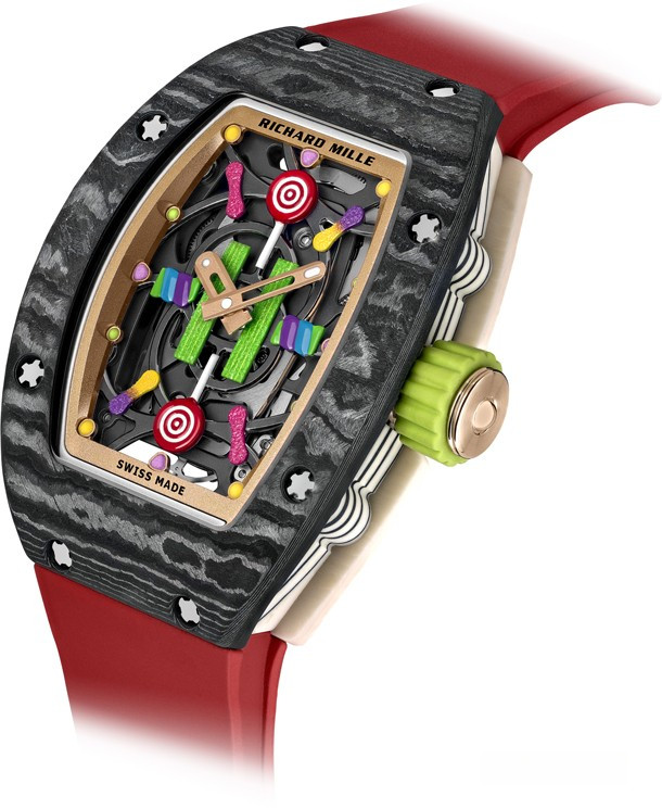 Часы Richard Mille Bonbon представлены в корпусе из карбона TPT размером 45.32 x 32.3 х 11.93 мм и водонепроницаемостью 50 м. Внутри корпуса установлен автоматический механизм, Калибр CRMA2, обладающий запасом хода 50 часов. На сером циферблате с декором 'сладости' отображаются часы, минуты. Часы комплектуются каучуковым ремешком с титановой вставкой. Серия ограничена - 30 шт.