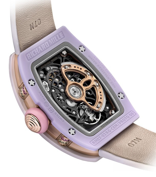 Часы Richard Mille Bonbon представлены в корпусе из керамики и розового золота 18к размером 45.32 x 32.3 х 11.93 мм и водонепроницаемостью 50 м. Внутри корпуса установлен автоматический механизм, Калибр CRMA2, обладающий запасом хода 50 часов. На разноцветном циферблате отображаются часы, минуты. Часы комплектуются каучуковым ремешком с титановой вставкой. Корпус инкрустирован цаворитами, розовыми сапфирами и цитринами, серия ограничена - 30 шт.