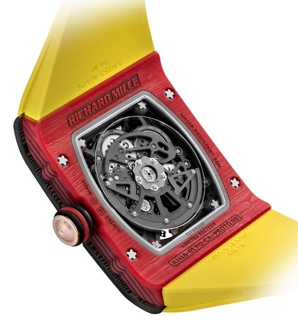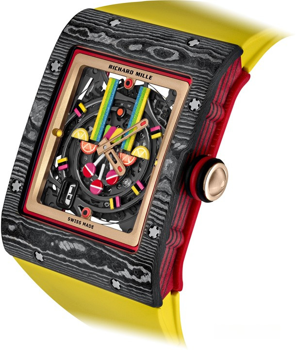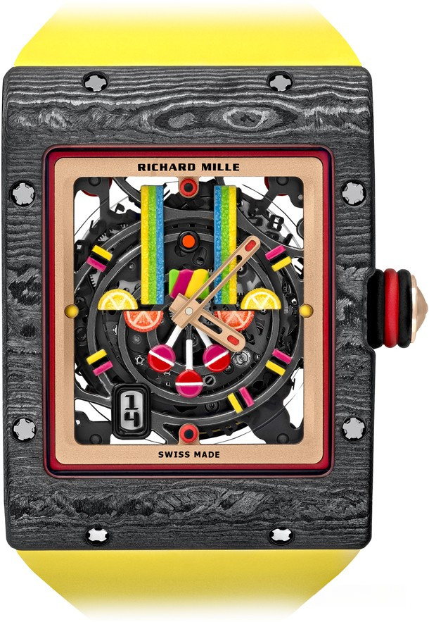 Часы Richard Mille Bonbon представлены в корпусе из карбона ТРТ размером 50.2 x 38 x 9.88 мм и водонепроницаемостью 50 м. Внутри корпуса установлен автоматический механизм, Калибр RM16-01, обладающий запасом хода 55 часов. На черном циферблате с мотивом 'сладости' отображаются часы, минуты, дата. Часы комплектуются каучуковым ремешком с титановой вставкой. Серия ограничена - 30 шт.