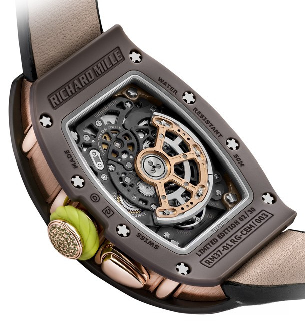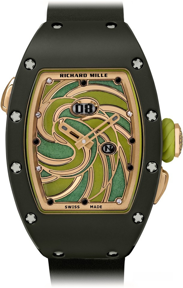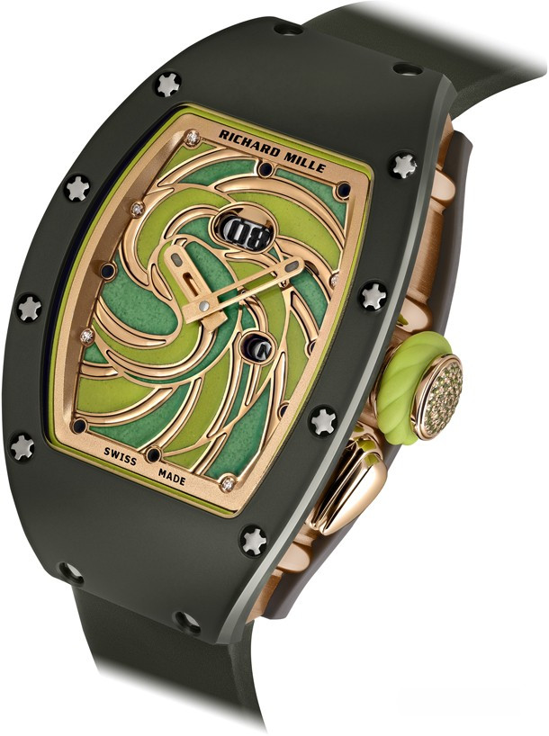 Часы Richard Mille Bonbon представлены в корпусе из керамики и розового золота 18к размером 52.65 x 34.4 x 13.08 мм и водонепроницаемостью 50 м. Внутри корпуса установлен автоматический механизм, Калибр CRMA1, обладающий запасом хода 50 часов. На зеленом с золотистым циферблате отображаются часы, минуты, дата, селектор функций. Часы комплектуются каучуковым ремешком с титановой вставкой. Серия ограничена - 30 шт.