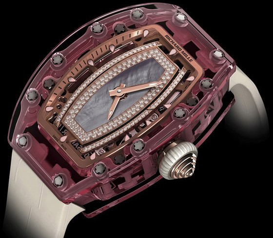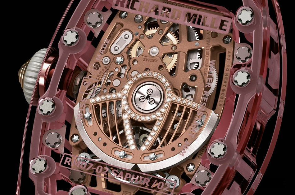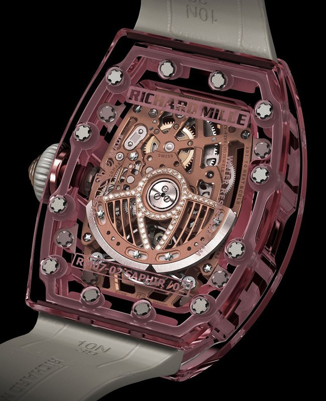 Часы Richard Mille RM 07-02 Automatic Pink Saphire представлены в корпусе из розового сапфира размером 32.9 х 46.75 мм. Внутри корпуса установлен автоматический механизм CRMA2 с запасом хода 50 часов. На сером жемчужном циферблате с белыми бриллиантами отображаются часы и минуты. Часы комплектуются каучуковым ремешком с титановой вставкой. Водонепроницаемость 50 метров.