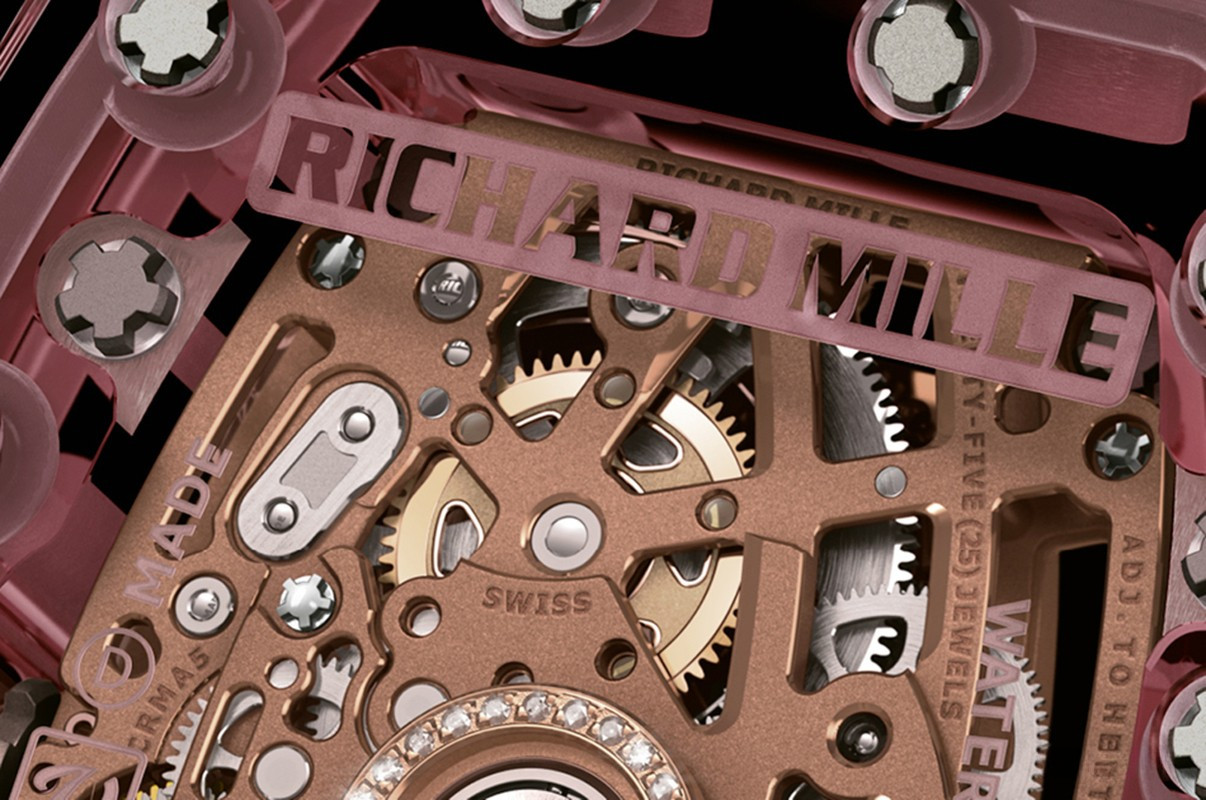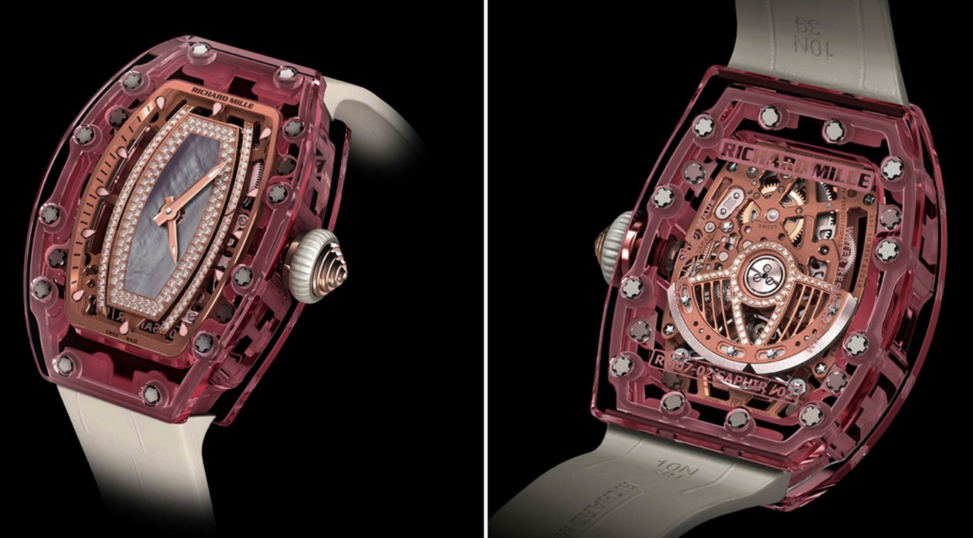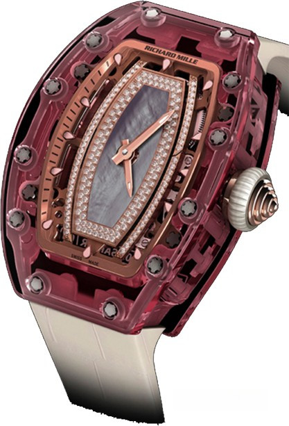 Часы Richard Mille RM 007-02 Pink Lady Sapphire представлены в прозрачном корпусе из розового поликристалла сапфира размером 32.9 х 46.75 мм. Внутри корпуса установлен автоматический механизм CRMA5 с запасом хода 50 часов. На сером жемчужном циферблате с белыми бриллиантами отображаются часы и минуты. Часы комплектуются каучуковым ремешком с титановой вставкой. Водонепроницаемость 50 метров.