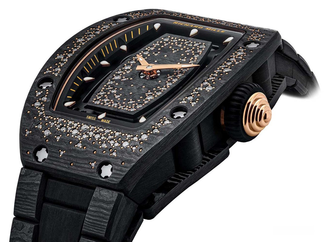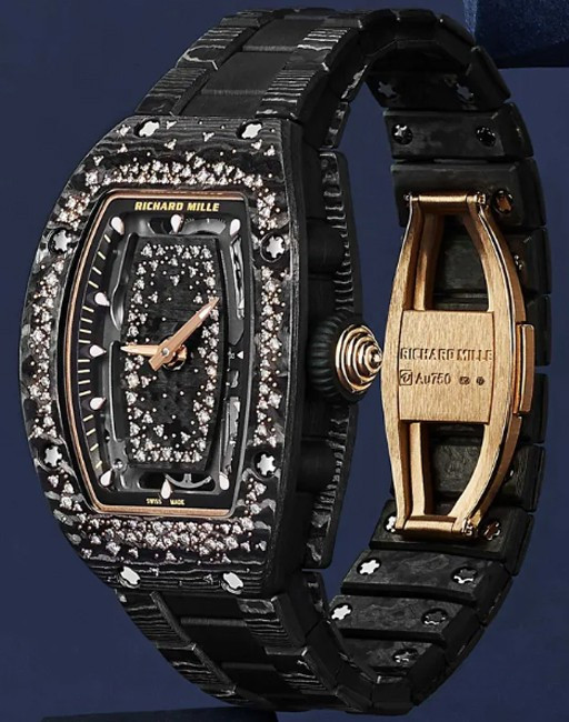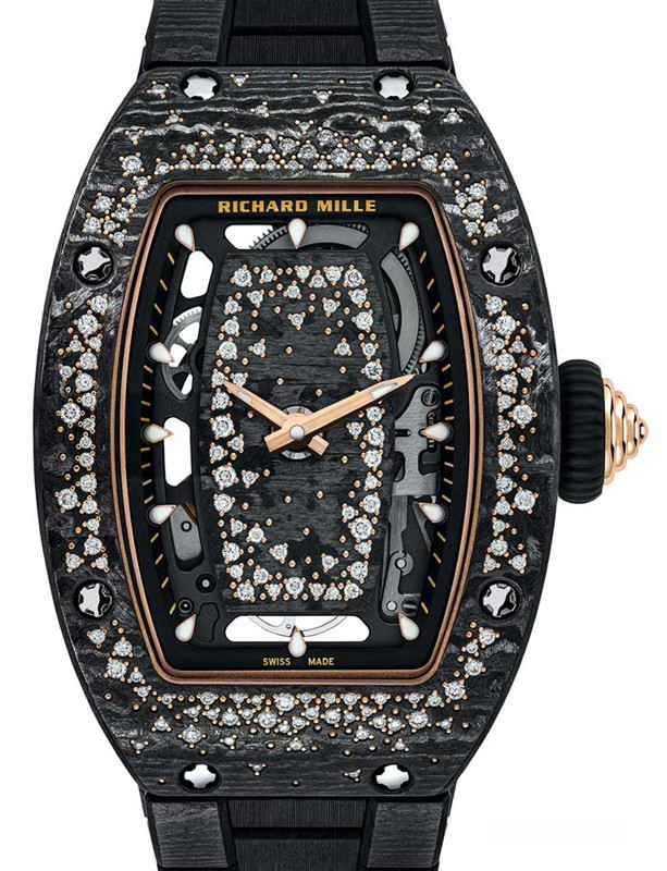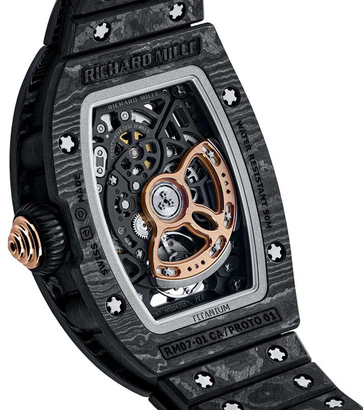 Часы Richard Mille RM 07-01 представлены в корпусе размером 45.66 x 31.4 x 11.85 мм из карбона и розового золота 18к водонепроницаемостью 50 метров. Внутри корпуса установлен автоматический механизм, Калибр CRMA2, обладающий запасом хода 50 часов. На черном циферблате из карбона с белыми бриллиантами отображаются часы и минуты. Часы поставляются на браслете из карбона. Корпус инкрустирован белыми бриллиантами.