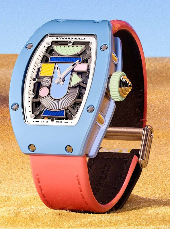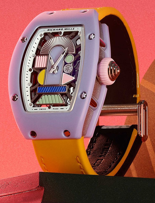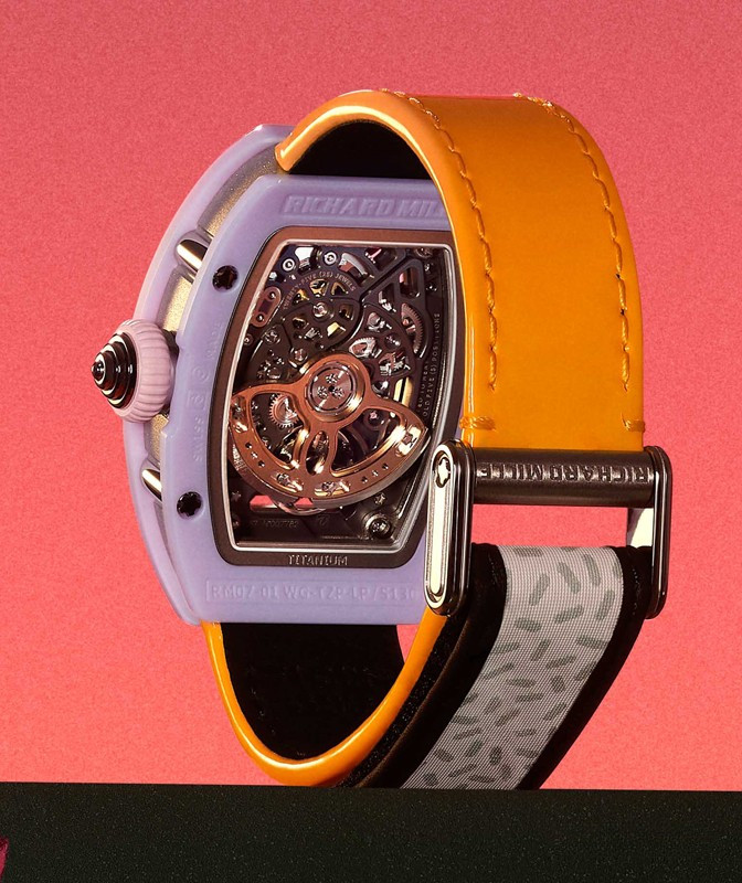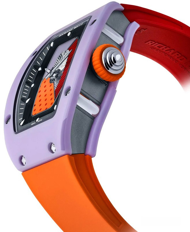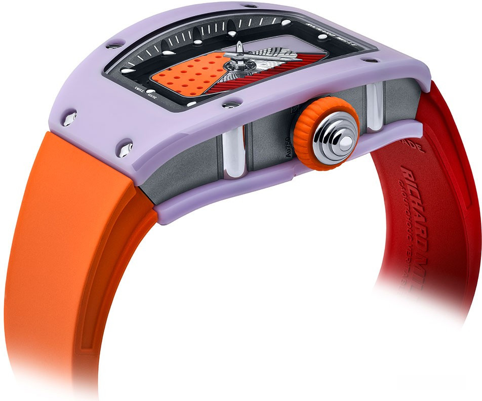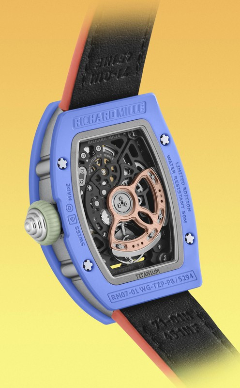 Часы Richard Mille RM 07-01 представлены в корпусе размером 45.23 x 31.4 x 11.85 мм из керамики и белого золота 18к водонепроницаемостью 50 метров. Внутри корпуса установлен автоматический механизм, Калибр CRMA2, обладающий запасом хода 50 часов. На черном циферблате с белыми бриллиантами отображаются часы и минуты. Часы поставляются на каучуковом ремешке с золотой застежкой. Серия ограничена - 50 шт.