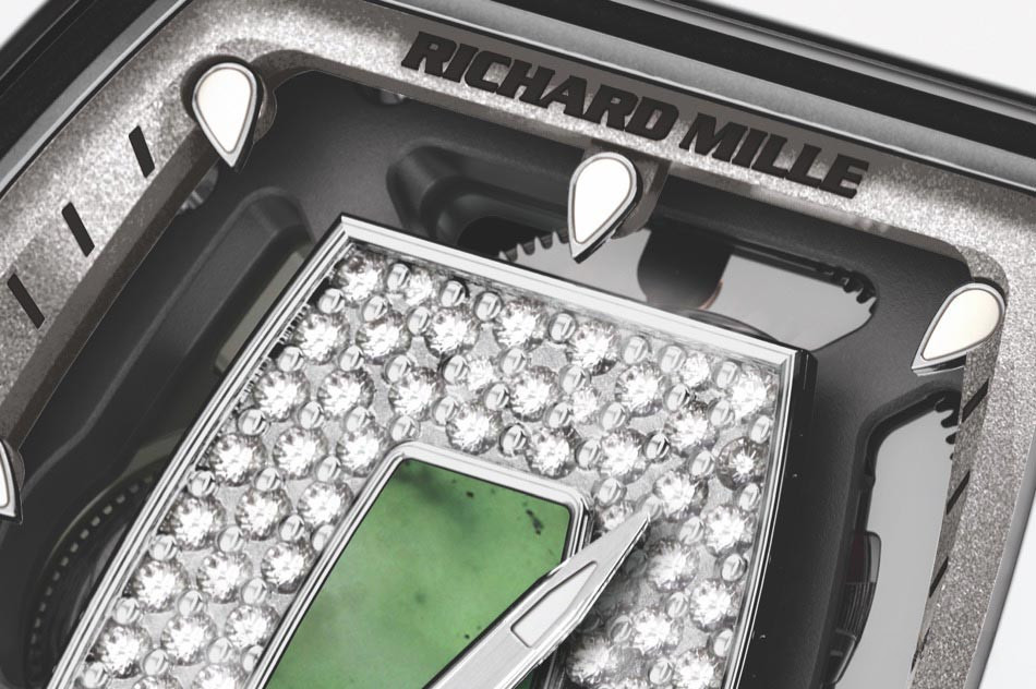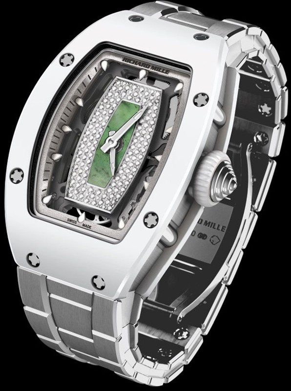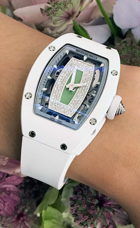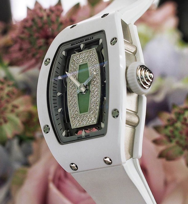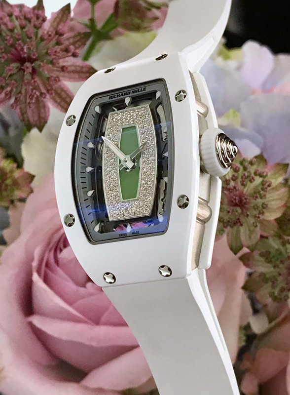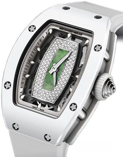 Часы Richard Mille RM 07-01 представлены в корпусе размером 45.66 x 31.4 x 11.85 мм из керамики и белого золота 18к водонепроницаемостью 50 метров. Внутри корпуса установлен автоматический механизм. На зеленом нефритовом циферблате с белыми бриллиантами отображаются часы и минуты. Часы поставляются на каучуковом ремешке с вставкой из белого золота 18к.
