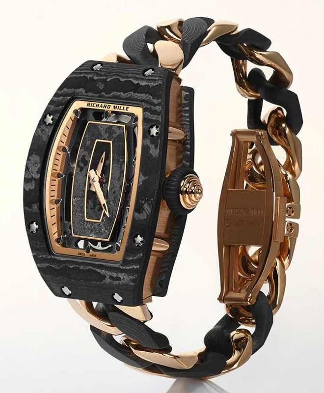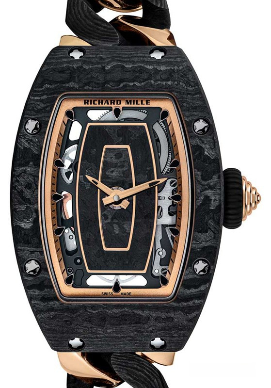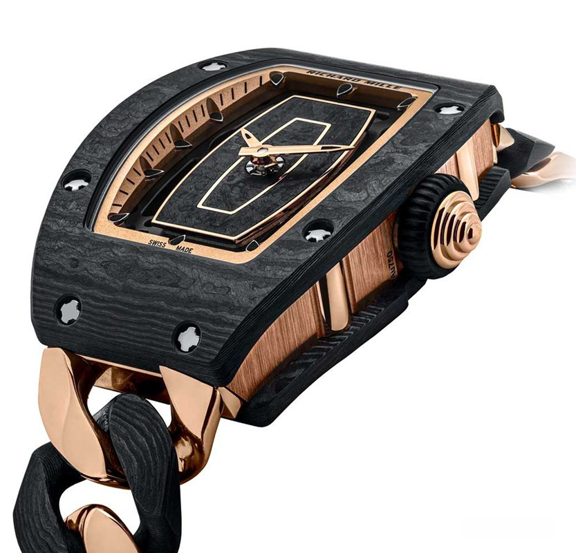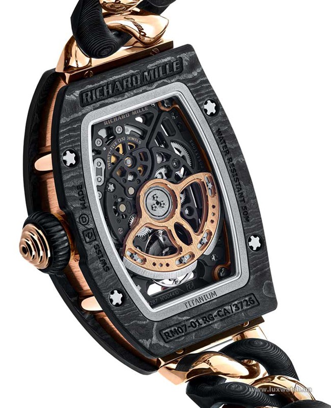 Часы Richard Mille RM 07-01 представлены в корпусе размером 45.66 x 31.4 x 11.85 мм из карбона и розового золота 18к водонепроницаемостью 50 метров. Внутри корпуса установлен автоматический механизм, Калибр CRMA2, обладающий запасом хода 50 часов. На черном циферблате отображаются часы и минуты. Часы поставляются на браслете из карбона и розового золота 18к.