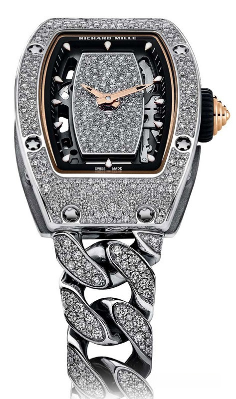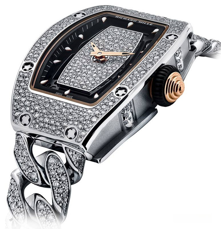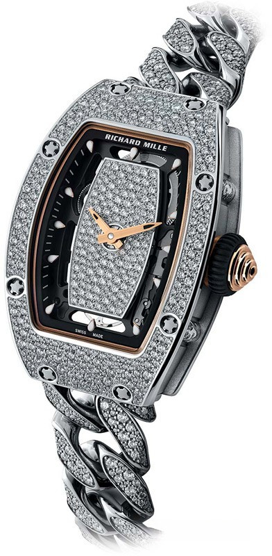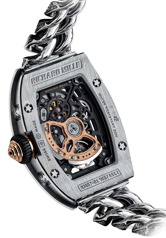 Часы Richard Mille RM 07-01 представлены в корпусе размером 45.66 x 31.4 x 11.85 мм из белого золота 18к водонепроницаемостью 50 метров. Внутри корпуса установлен автоматический механизм, Калибр CRMA2, обладающий запасом хода 50 часов. На циферблате с белыми бриллиантами отображаются часы и минуты. Часы поставляются на браслете из белого золота 18к, инкрустированном белыми бриллиантами. Корпус инкрустирован белыми бриллиантами.