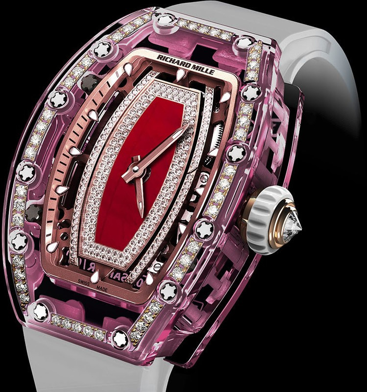 Часы Richard Mille RM 07-02 Automatic Sapphire представлены в корпусе из сапфира размером 46.75 х 32.9 х 14.35 мм и водонепроницаемостью 30 метров. Внутри корпуса установлен автоматический механизм CRMA5. На красном циферблате с белыми бриллиантами отображаются часы, минуты. Часы поставляются на каучуковом ремешке с вставкой из нержавеющей стали. Корпус инкрустирован белыми бриллиантами.