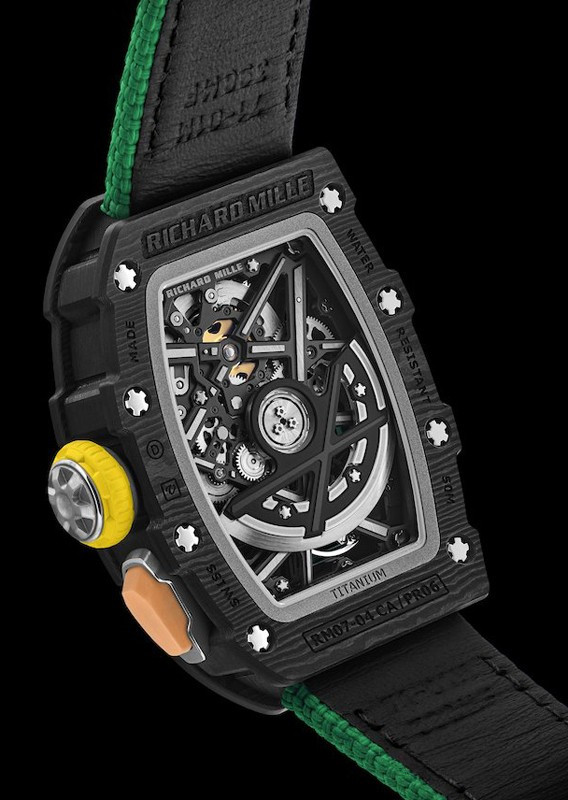Часы Richard Mille RM 07-04 Automatic Sport представлены в корпусе размером 30.5 x 44.95 x 10.35 мм из карбона ТРТ водонепроницаемостью 50 метров. Внутри корпуса установлен автоматический механизм, Калибр CRMA8, обладающий запасом хода 50 часов. На черном скелетированном циферблате отображаются часы, минуты, переключатель функций. Часы поставляются на кожаном ремешке с титановой застежкой.