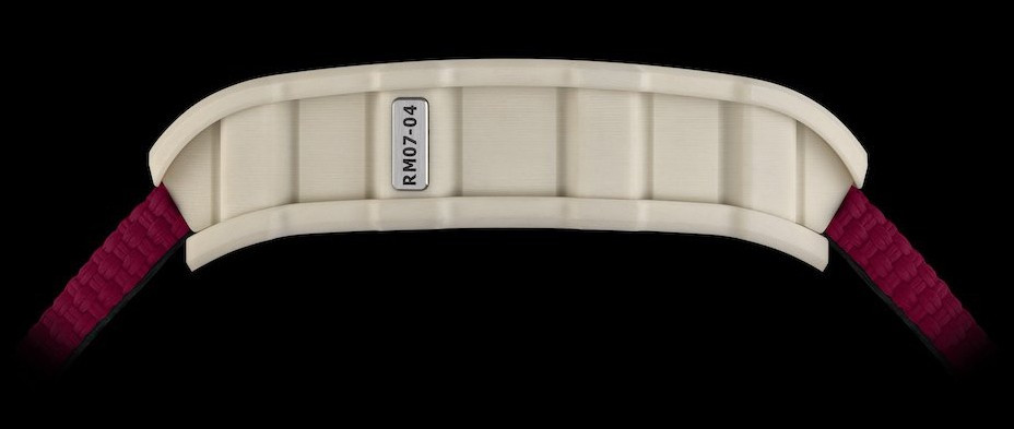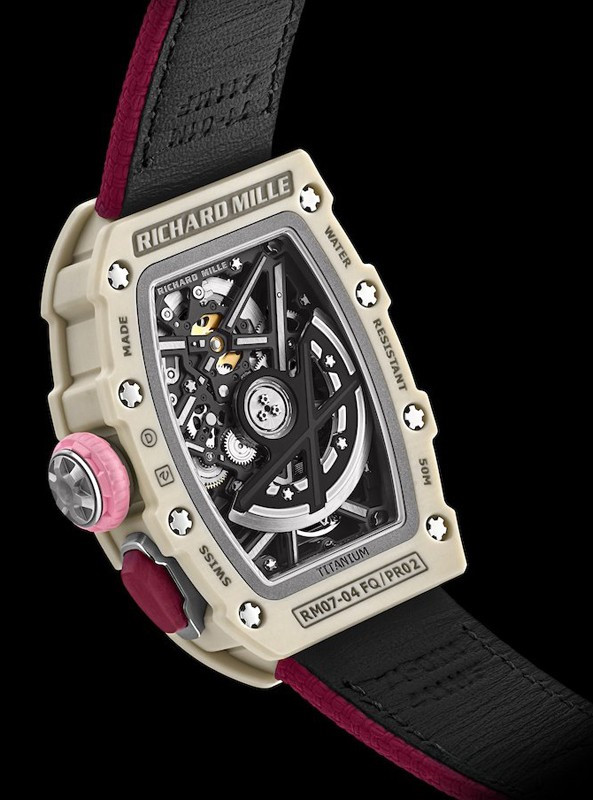 Часы Richard Mille RM 07-04 Automatic Sport представлены в корпусе размером 30.5 x 44.95 x 10.35 мм из кварца ТРТ водонепроницаемостью 50 метров. Внутри корпуса установлен автоматический механизм, Калибр CRMA8, обладающий запасом хода 50 часов. На черном скелетированном циферблате отображаются часы, минуты, переключатель функций. Часы поставляются на кожаном ремешке с титановой застежкой.