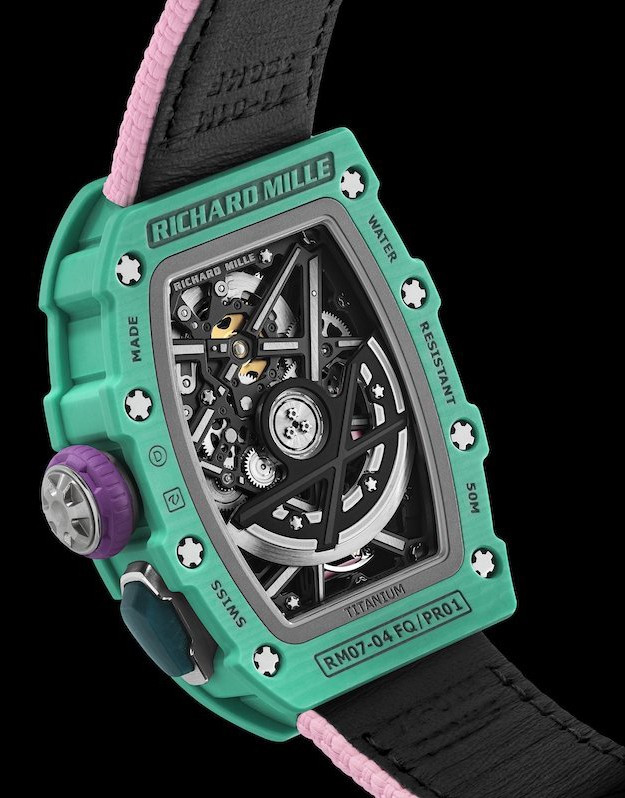 Часы Richard Mille RM 07-04 Automatic Sport представлены в корпусе размером 30.5 x 44.95 x 10.35 мм из кварца ТРТ водонепроницаемостью 50 метров. Внутри корпуса установлен автоматический механизм, Калибр CRMA8, обладающий запасом хода 50 часов. На черном скелетированном циферблате отображаются часы, минуты, переключатель функций. Часы поставляются на кожаном ремешке с титановой застежкой.