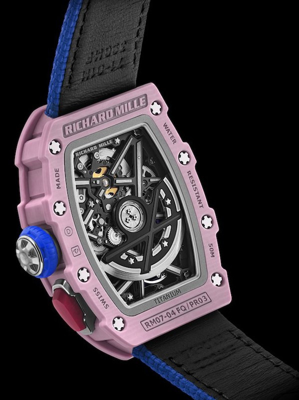 Часы Richard Mille RM 07-04 Automatic Sport представлены в корпусе размером 30.5 x 44.95 x 10.35 мм из кварца ТРТ водонепроницаемостью 50 метров. Внутри корпуса установлен автоматический механизм, Калибр CRMA8, обладающий запасом хода 50 часов. На черном скелетированном циферблате отображаются часы, минуты, переключатель функций. Часы поставляются на кожаном ремешке с титановой застежкой.