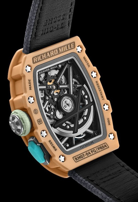 Часы Richard Mille RM 07-04 Automatic Sport представлены в корпусе размером 30.5 x 44.95 x 10.35 мм из кварца ТРТ водонепроницаемостью 50 метров. Внутри корпуса установлен автоматический механизм, Калибр CRMA8, обладающий запасом хода 50 часов. На черном скелетированном циферблате отображаются часы, минуты, переключатель функций. Часы поставляются на кожаном ремешке с титановой застежкой.