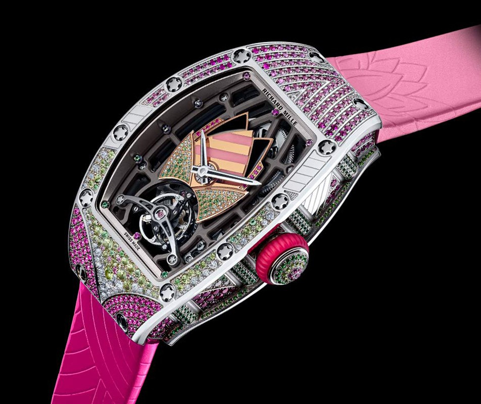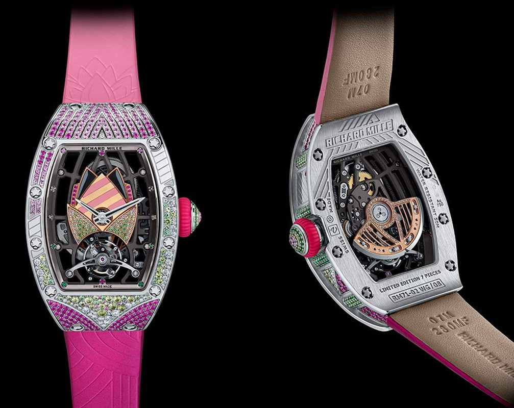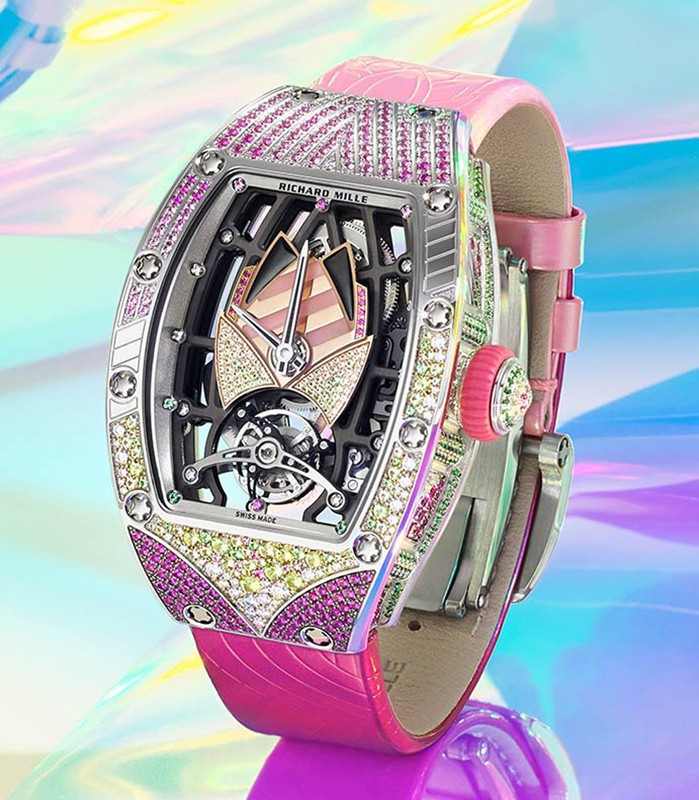 водонепроницаемость 30 м, корпус инкрустирован белыми бриллиантами, сапфирами, перидотами, рубинами, гематитом, розовым опалом, серия ограничена (7 шт.)