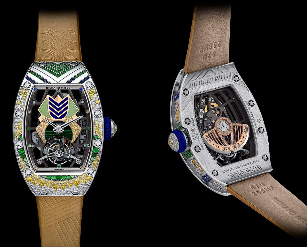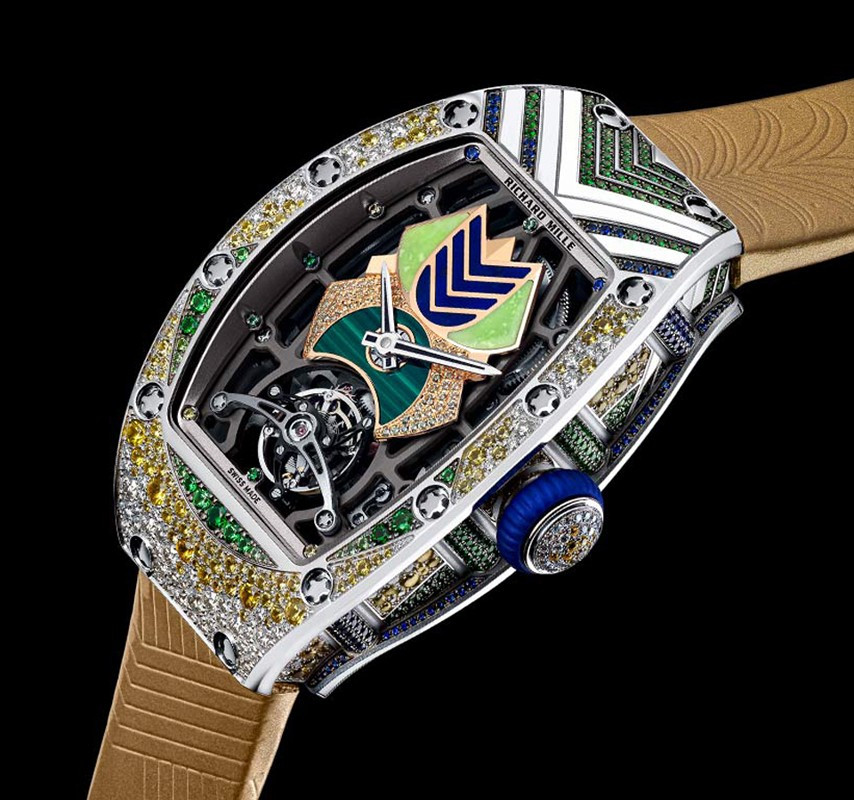водонепроницаемость 30 м, корпус инкрустирован белыми бриллиантами, сапфирами, цаворитами, перидотами, лазуритом, хризоломоном, малахитом, серия ограничена (7 шт.)
