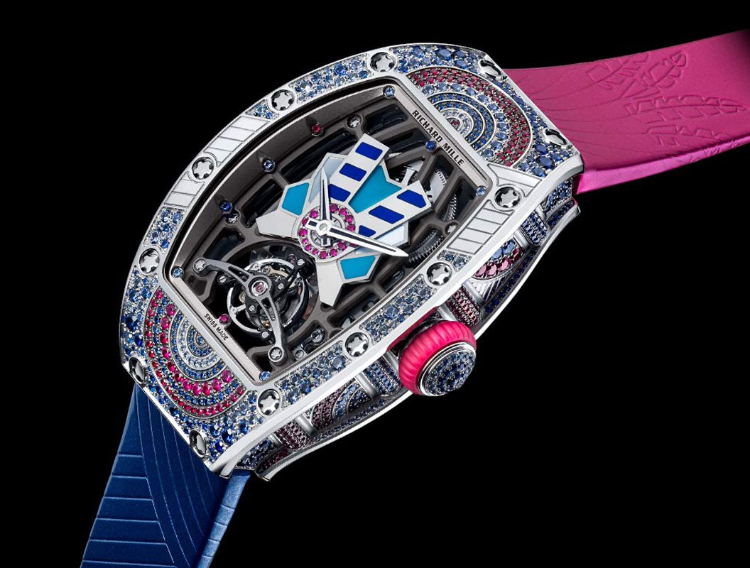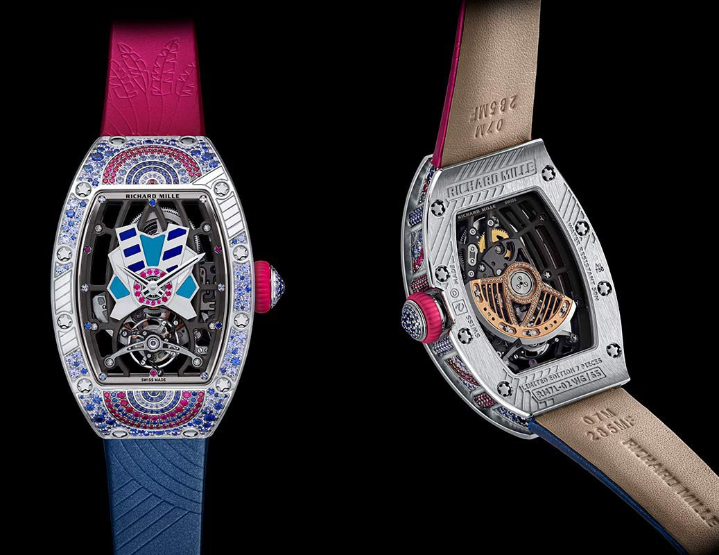 Часы Richard Mille RM 71-02 Automatic Tourbillon Talisman выпущены в корпусе из белого золота 18к размером 52.2 x 34.4 x 12.5 мм и водонепроницаемостью 30 м. Корпус инкрустирован сапфирами, рубинами, бриллиантами, лазуритом, белым перламутром, бирюзой. Внутри корпуса установлен автоматический механизм, Калибр CRMT1. Циферблат белый с синим, розовые сапфиры. На циферблате отображаются часы, минуты. Запас хода 50 часов. Часы комплектуются кожаным ремешком с золотой вставкой. Серия ограничена - 7 шт.