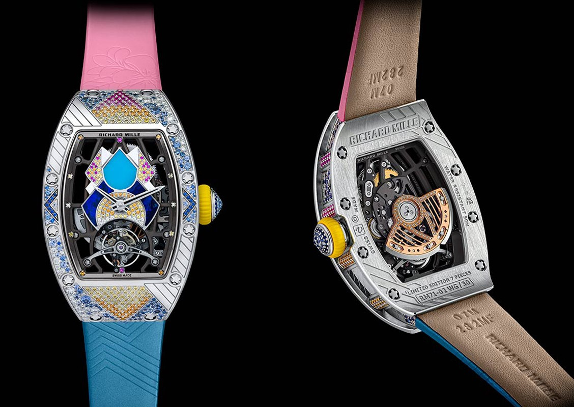Часы Richard Mille RM 71-02 Automatic Tourbillon Talisman выпущены в корпусе из белого золота 18к размером 52.2 x 34.4 x 12.5 мм и водонепроницаемостью 30 м. Корпус инкрустирован сапфирами, бриллиантами, аметистами, цавориты, рубины, хризопразом, опалом. Внутри корпуса установлен автоматический механизм, Калибр CRMT1. Циферблат синий, белые бриллианты, сапфиры, рубины. На циферблате отображаются часы, минуты. Запас хода 50 часов. Часы комплектуются кожаным ремешком с золотой вставкой. Серия ограничена - 7 шт.