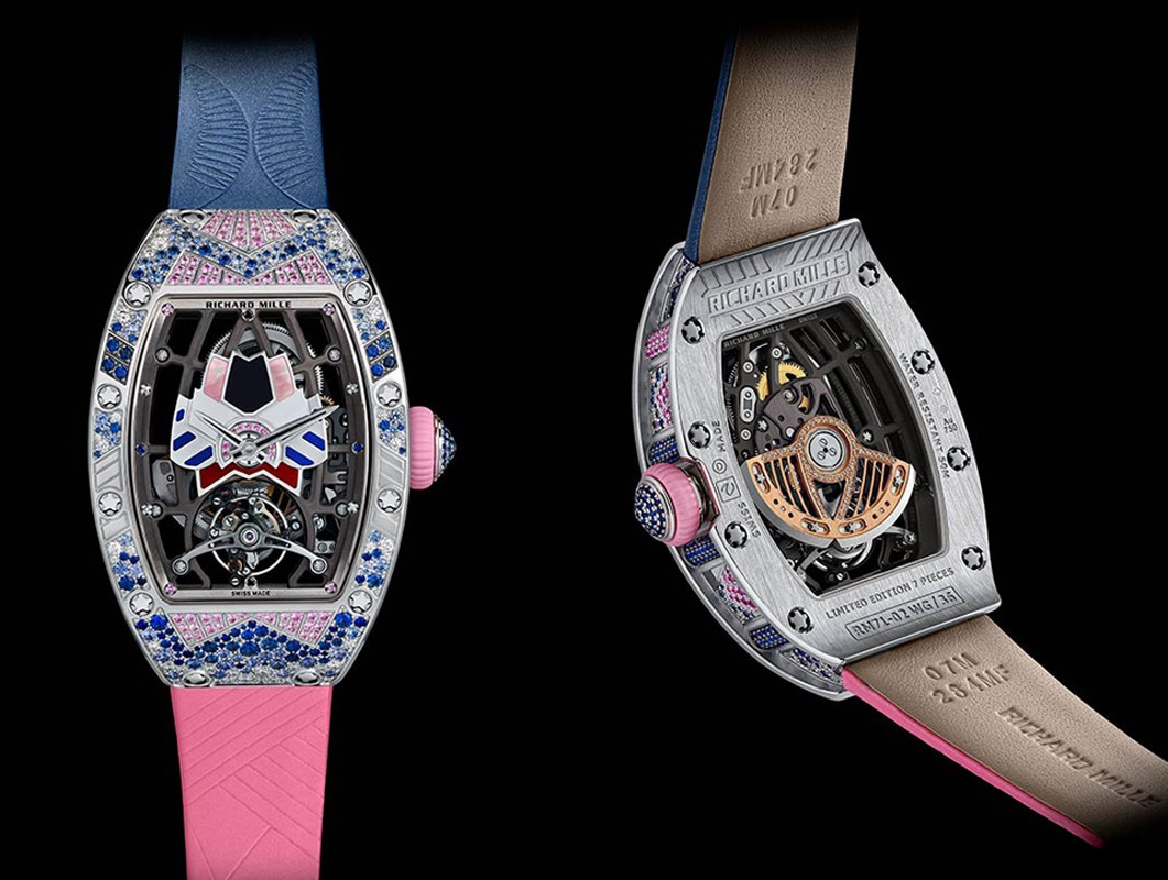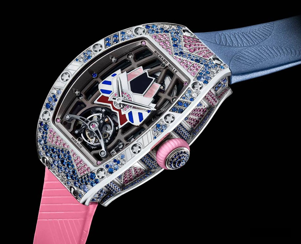 Часы Richard Mille RM 71-02 Automatic Tourbillon Talisman выпущены в корпусе из белого золота 18к размером 52.2 x 34.4 x 12.5 мм и водонепроницаемостью 30 м. Корпус инкрустирован сапфирами, бриллиантами, розовым перламутром, лазуритом, яшмой, ониксом, черной шпинелью. Внутри корпуса установлен автоматический механизм, Калибр CRMT1. Циферблат белый, розовые сапфиры. На циферблате отображаются часы, минуты. Запас хода 50 часов. Часы комплектуются кожаным ремешком с золотой вставкой. Серия ограничена - 7 шт.