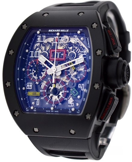 Часы Richard Mille RM 011 представлены в корпусе размером 49 х 38 мм из карбона водонерпоницаемостью до 50 метров. Внутри корпуса установлен автоматический механизм. На черном скелетированном циферблате отображаются часы, минуты, секунды, дата, накопители хронографа. Часы копмлектуются каучуковым ремешком с титановой вставкой.