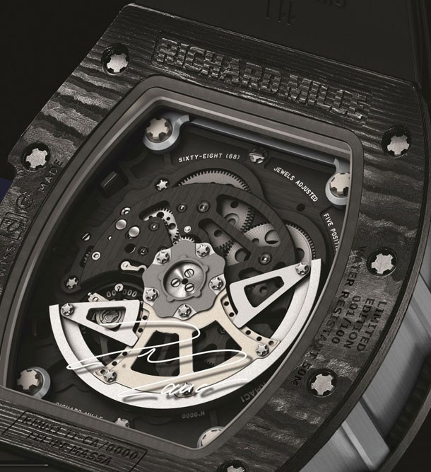 Юбилейная серия RM 011 Felipe Massa 10th Anniversary представлена моделью в карбоновом корпусе размером 50 x 40 х 16.15 мм, водонепроницаемостьюд о 50 метров. Внутри корпуса установлен механизм с ручным заводом, Калибр RM 011-S с запасом хода 55 часов и функциями часов, минут, секунд, даты, тахиметра и хронографа. Циферблат черный скелетированный. Часы комплектуются черным каучуковым ремешком с титановой застежкой. Модель выпущена ограниченной серией 100 штук.