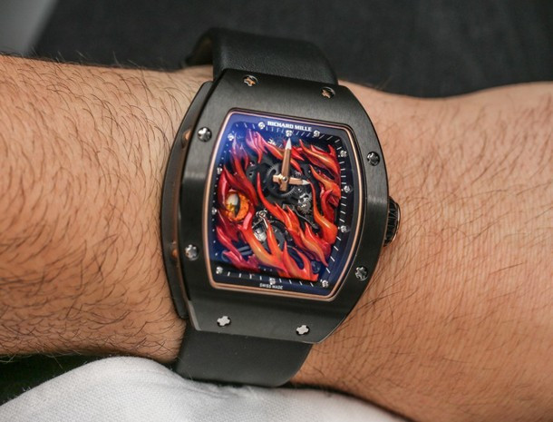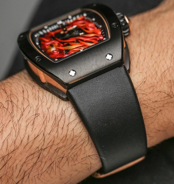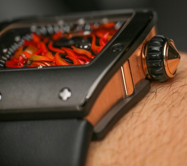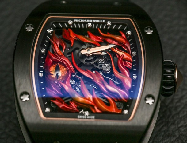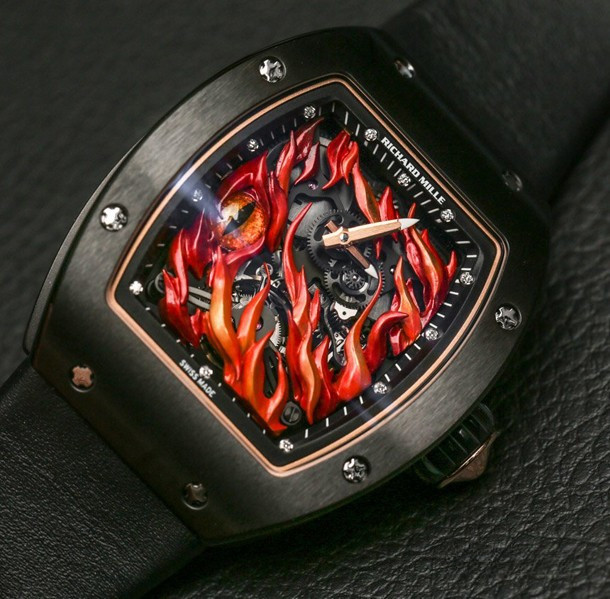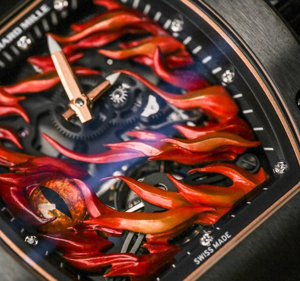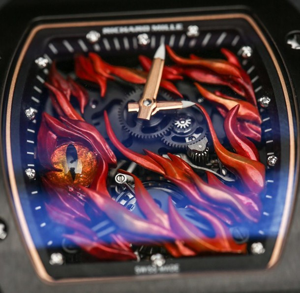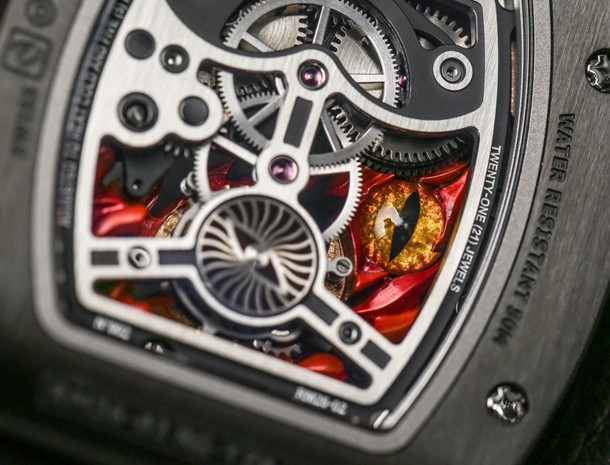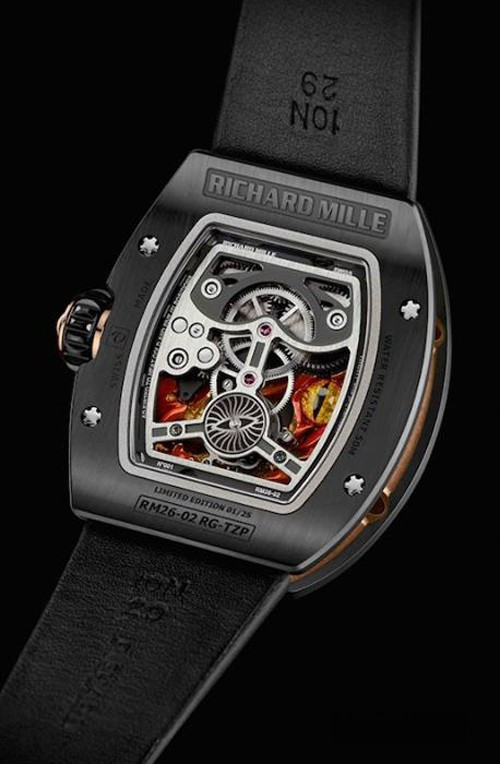 Корпус РМ 26-02 выполнен из красного золота 18к, а также из черной керамики. Материалы великолепно контрастируют друг с другом в работе с темным и огненным стилем циферблата. Ширина корпуса составляет 40 мм в ширину, в длину – 48 мм, а толщина – 13 мм. Размер не из мелких, но в сравнении с меньшими современными моделями Richard Mille бочкообразной формы данная весьма удобно сидит на запястьи. Сам зловещий глаз тщательно украшен эмалировкой, а пламя выполнено из чистого золота, а затем лакировано. Все это вплетено в Калибр Richard Mille RM 26-02 с ручным заводом, индикацией часов, минут и минутным турбийоном. Также на циферблате находится небольшой индикатор запаса хода. При частоте работы в 3 Гц запас хода модели составляет 50 часов, большая часть часового механизма выполнена из титана. Тираж модели составляет 25 единиц.