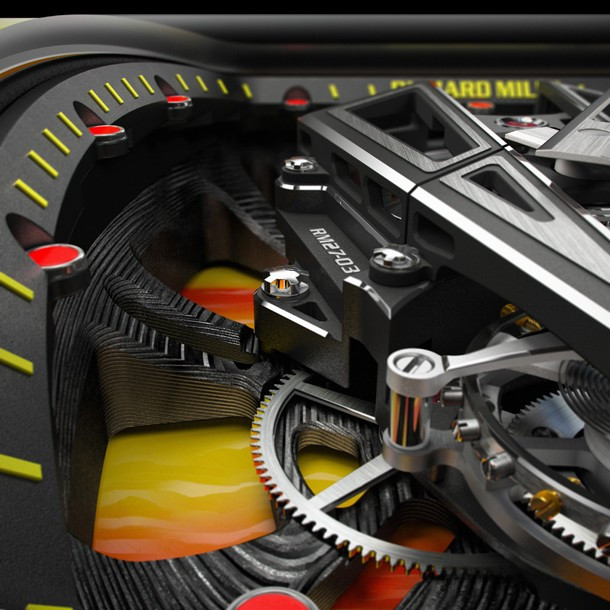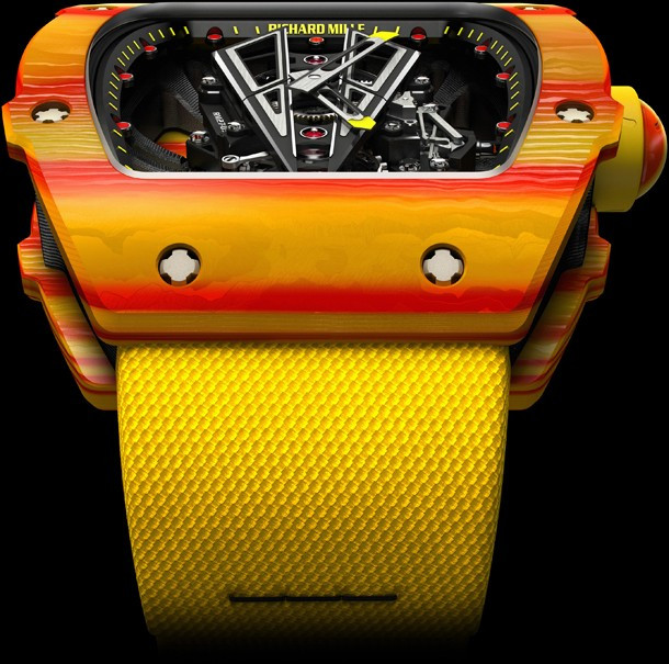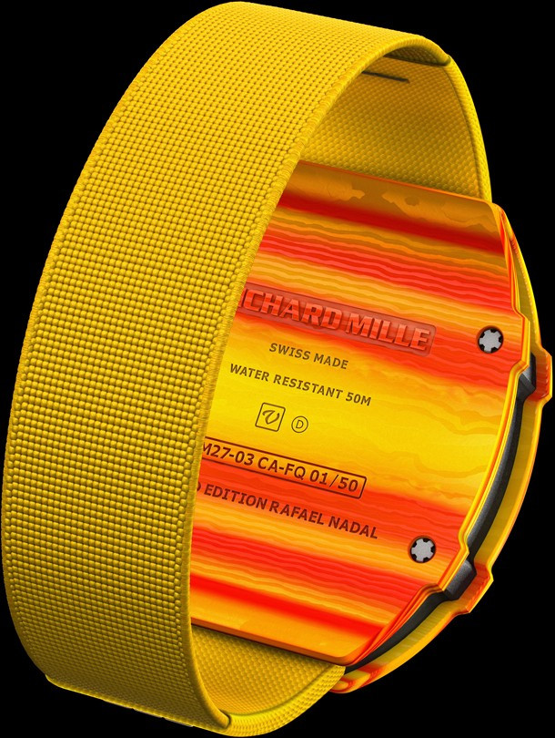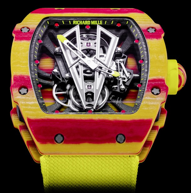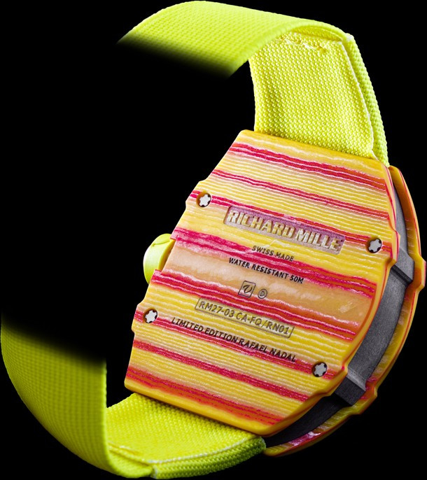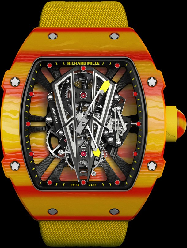 Richard Mille RM 27-03 Tourbillon Rafael Nadal является результатом партнерства с одним из величайших теннисистов нашего времени: Рафаэлем Надалем. Супер-легкие часы, с усложненным механизмом, впечатляющей конструкцией корпуса, инновационным и потрясающим материалом и очень высокой устойчивостью к ударам. Корус изготовлен из ТРТ кварца - впервые в часовом деле. Этот уникальный красный и желтый цвет создан благодаря слоям конструкции (всего более 600 слоев), где чередуется кварц и углеродные волокна. Инженеры Richard Mille разработали весьма оригинальный материал, известный как TPT кварц, состоящий из сотен слоев кварцевых волокон, сложенных друг на друга. Автоматизированная система размещения чередует слои кварца со слоями карбона NTPT, располагая волокна соседних слоев под углом 45 градусов. Слои проявляются на поверхности в хаотичном порядке, делая каждую модель часов уникальной. Часы очень легкие на запястье, но, главное, чрезвычайно устойчивы к ударам (до 5000 г) – и оказались очень практичными на запястье Рафаэля Надаля, чей удар по мячу составляет 215 км / ч. Внутри корпуса установлен полностью скелетонизированный Калибр турбийона с высококачественной отделкой. Механизм способен обеспечить 70 часов запаса хода и обладает турбийоном всего лишь в 3,35 грамм. Все это не помешало выполнить роскошную финишную отделку ручной работы часов Richard Mille RM 27-03 Tourbillon Rafael Nadal (англаж, стеклоструйная обработка и сатинирование).