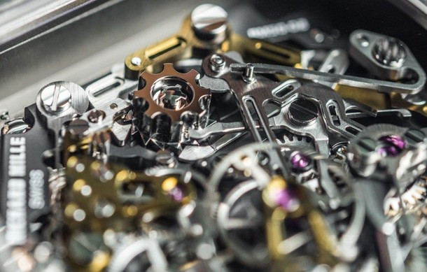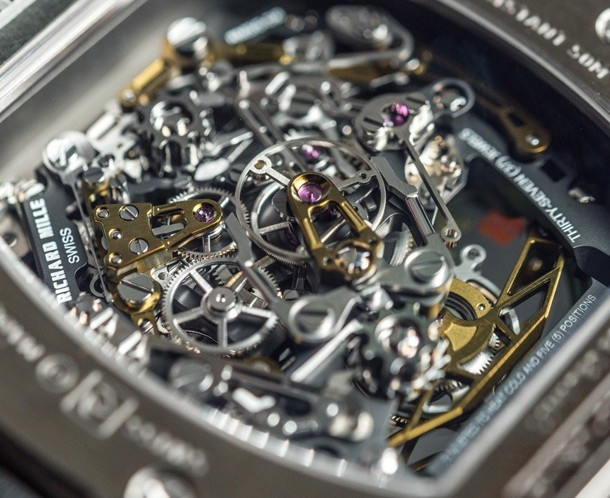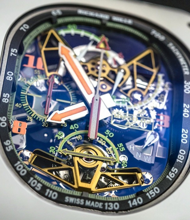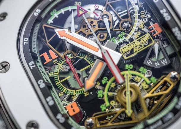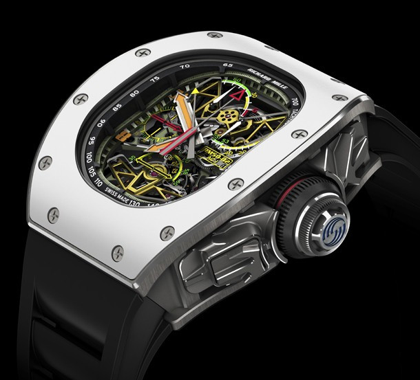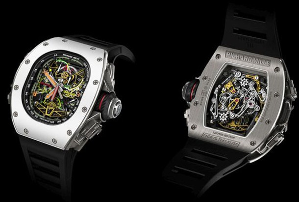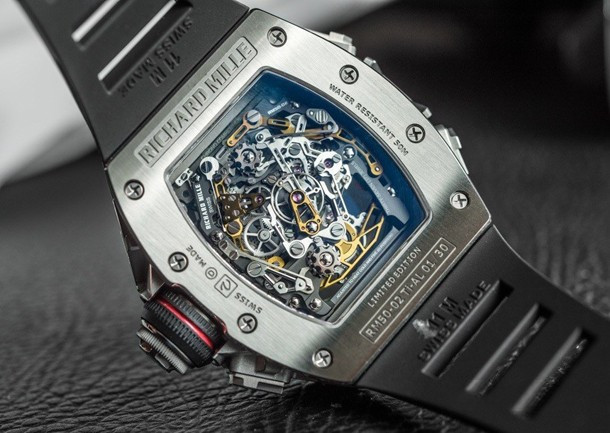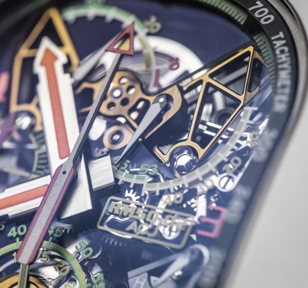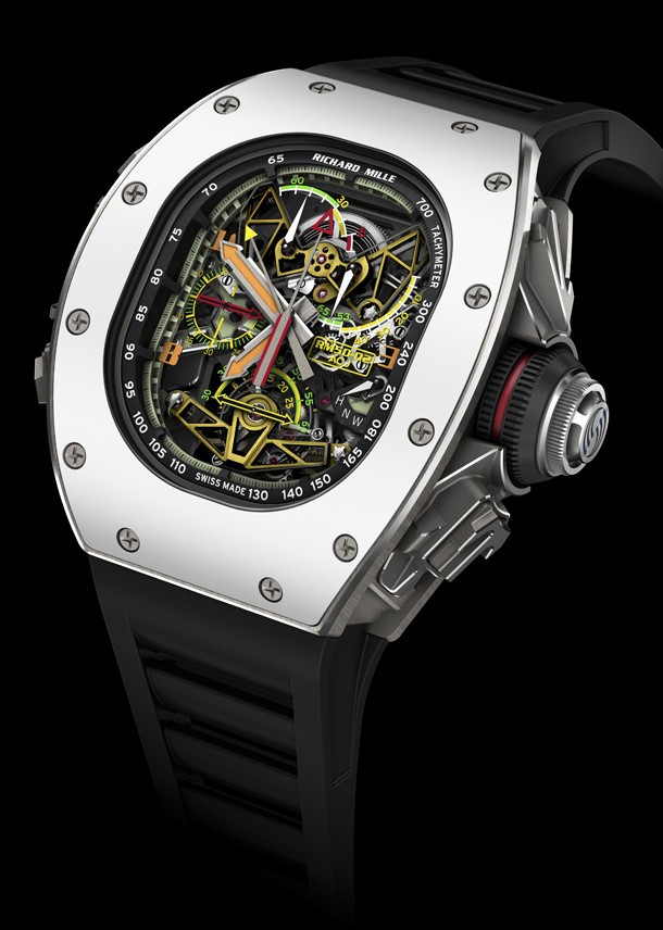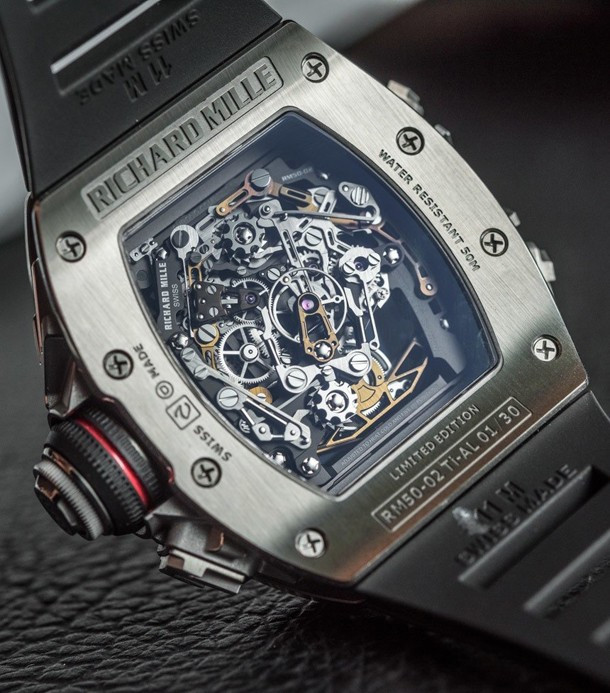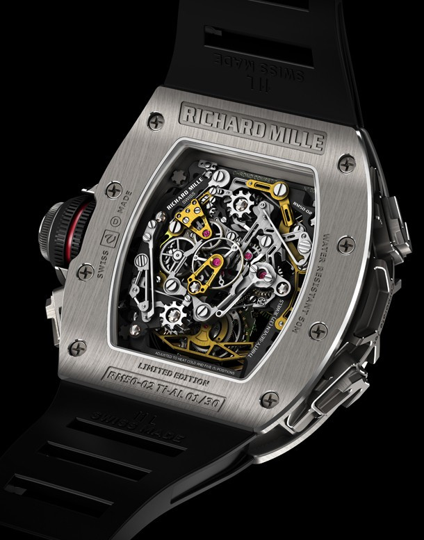 Ограниченный выпуск из 30 экземпляров из сплава титана и алюминия. Калибр RM50-02: механизм с ручным заводом, турбийон, индикация часов и минут, сплит-секундный хронограф с плавной секундной стрелкой, 60-минутный счетчик, индикаторы запаса хода, выбранной функции и крутящего момента. Размеры: 50,1 x 42,7 x 16,5 мм. Запас хода около 70 часов, отображается на цифровой шкале у отметки «11 часов». Дизайн и качество изготовления этой модели отражают принципиально новый, концептуальный подход к механизму, корпусу и циферблату. Каждый из компонентов выполнен в соответствии с предельно строгими требованиями, что напоминает аналитически-инженерный подход к созданию гоночных автомобилей Формулы-1, согласно которомушасси и двигатель разрабатываются одновременно. Так, в данной модели отсутствует корпусное кольцо: механизм установлен на каучуковые опоры (ISO SW), зафиксированные четырьмя титановыми винтами еще одно свидетельство уникального мастерства не терпящего компромиссов.