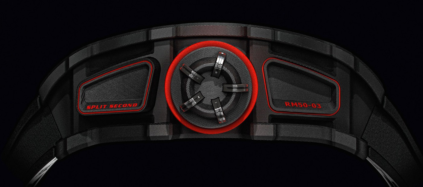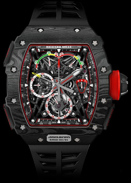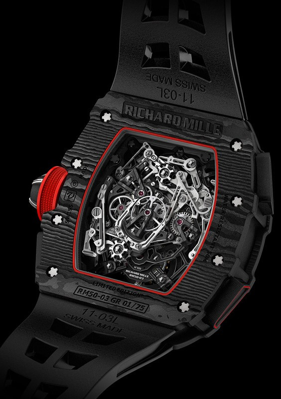 Ограниченная серия из 75 экземпляров, изготовленных с применением материала Graph TPT™, Калибр RM 50-03: механизм с ручным заводом, турбийон, индикация часови минут, сплит-хронограф, 30-минутный счетчик, индикаторы запаса хода, крутящего момента и выбранной функции. Размеры: 44.5 x 49.65 x 16.1 мм. Запас хода 70 часов.