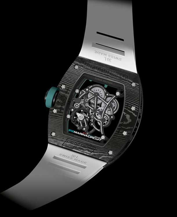 Часы Richard Mille RM 055 Yas Marina Circuit представлены в корпусе из карбона размером 42.7 мм водонепроницаемостью 30 метров. Внутри корпуса установлен автоматический механизм, обладающий запасом хода 55 часов. На черном скелетированном циферблате отображаются часы, минуты, секунды. Часы поставляются на каучуковом ремешке с титановой вставкой. Серия ограничена - 50 шт.