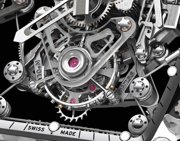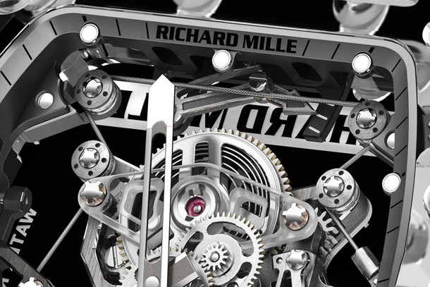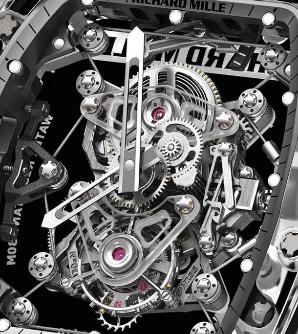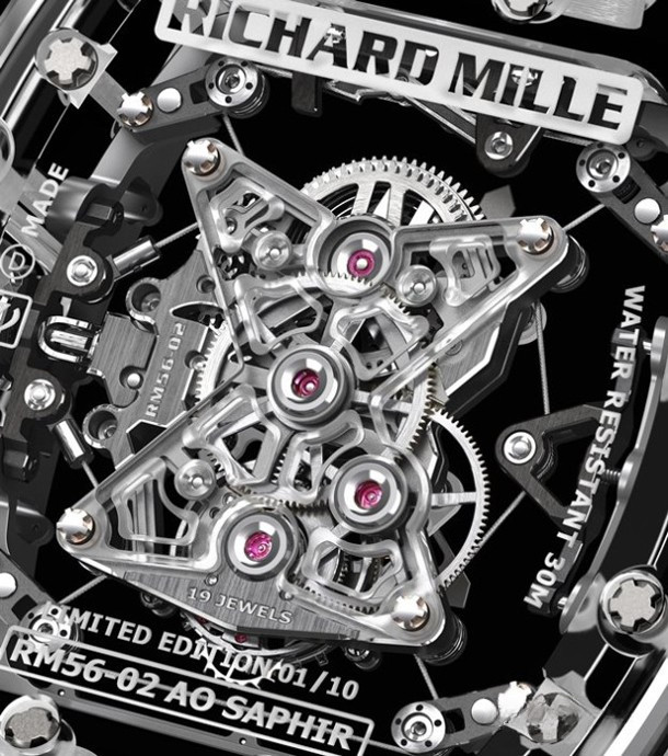 Подвесной тросовый механизм был помещен в прозрачный сапфировый корпус, что придало часам фантастический визуальный эффект. На циферблате можно разглядеть турбийон с сапфировым мостом и элементами системы тросовой подвески. Специально разработанный оплеточный тросик толщиной 0.35 мм, пропущен сквозь 4 шкива, закрепленных в вершинах палеты часового механизма, и сквозь 6 шкивов, помещенных вдоль внутренней части корпуса. Основная палета РМ 56-02, созданная из титана класса 5, полностью подвешена в сапфировом корпусе. Натяжение троса прекрасно контролируется миниатюрным храповиком возле отметки в 9 часов. Вся тросовая система присоединена к отдельному индикатору, расположенному ниже отметки в 12 часов, что легко позволяет визуально проверить натяжения тросика и удостовериться, что он работает в пределах определенных норм. Модель выпущена тиражом в количестве 10 шт.