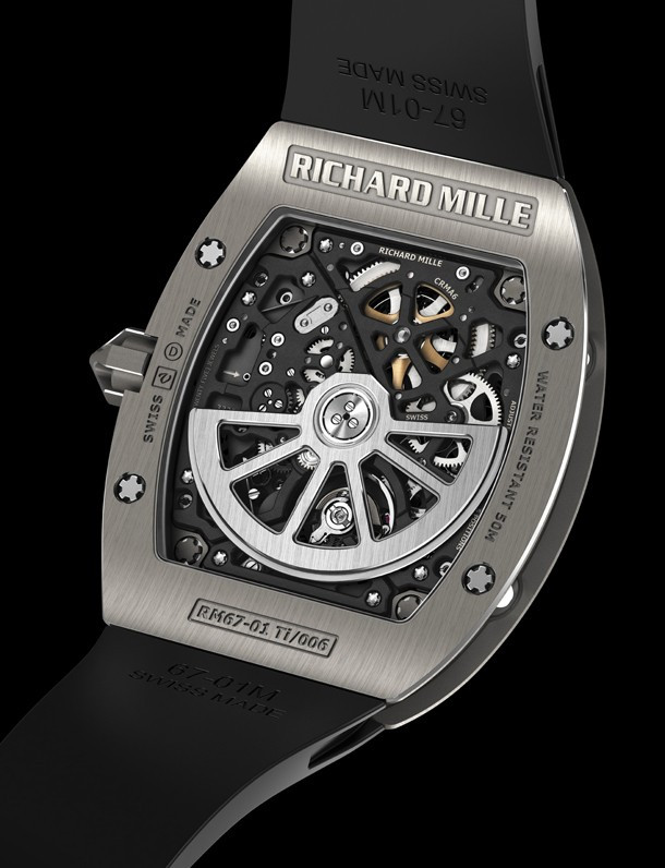 Автоматический механизм CRMA6, созданный специально для модели RM 67-01, – это новый калибр толщиной всего 3,6 мм, разработанный инженерами Richard Mille в Ле-Брёлё. Современная архитектура калибра напоминает увлекательный механический конструктор. Корпус новой знаковой модели имеет бочкообразную форму и отличается очень небольшой толщиной. В силу очень малой толщины его изготовление занимает больше времени по сравнению с подобными корпусами коллекции RM. Сам процесс производства этого корпуса насчитывает 215 различных станочных операций. Часы комплектуются каучуковым ремешком с титановой вставкой.