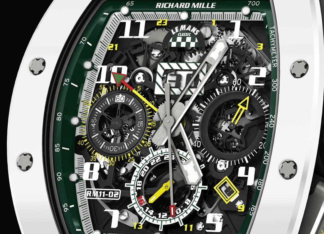 RM 11-02 Le Mans Classic – это ограниченная серия из 150 экземпляров. Новинка - автоматический хронограф с функцией обратного хода, обладающий запасом хода 55 часов. Корпус размером 50 х 42.7 х 16.15 мм изготовлен из керамики и карбона. Водонепроницаемость составляет 50 метров. На сером скелетированном циферблате отображаются часы, минуты, секунды, дата, месяц, тахиметр. Часы комплектуются каучуковым ремешком с титановой вставкой.