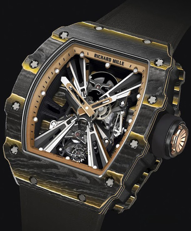 Модель RM 12-01 представлена в четырех версиях, каждая из которых ограничена 18 штуками и реализуется через бутики RM в Северной и Южной Америке. Часы RM 12-01 Tourbillon обладают корпусом из карбона TPT черного цвета, из карбона ТРТ и красного кварца, из карбона ТРТ и белого кварца или карбона TPT и розового золота 18к. Легкий корпус 12-01 Tourbillon имеет размеры 48 х 39.3 х 13.84 мм. Все четыре версии поставляются на спортивном черном каучуковом ремешке с титановой застежкой.