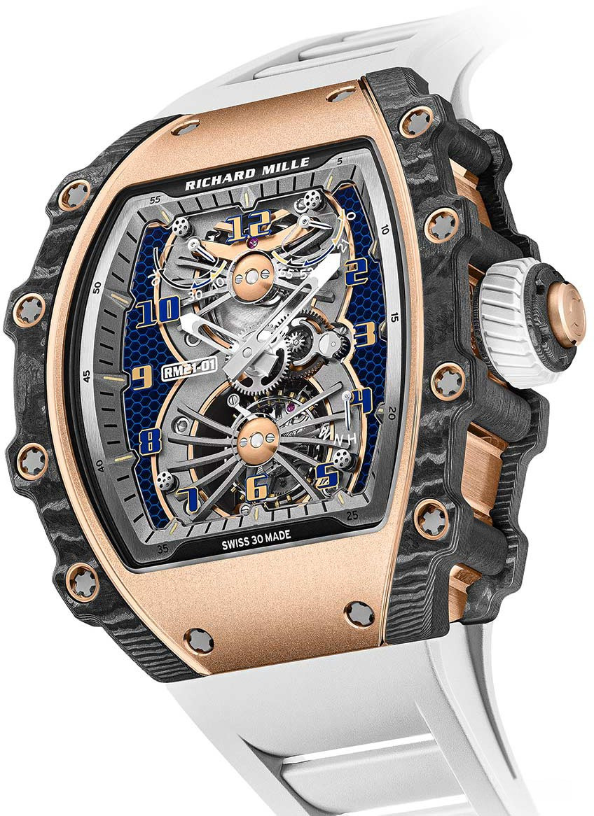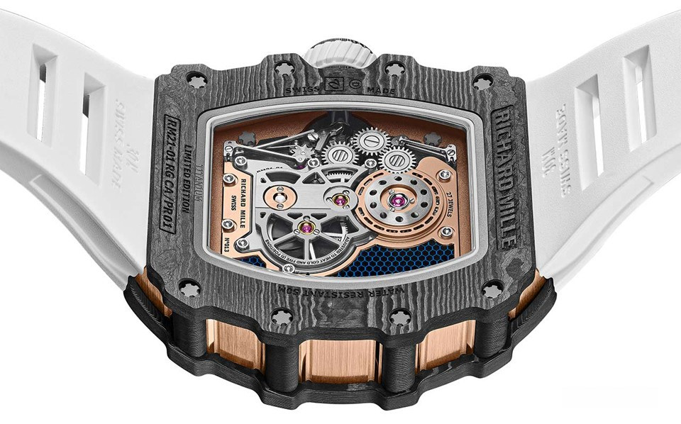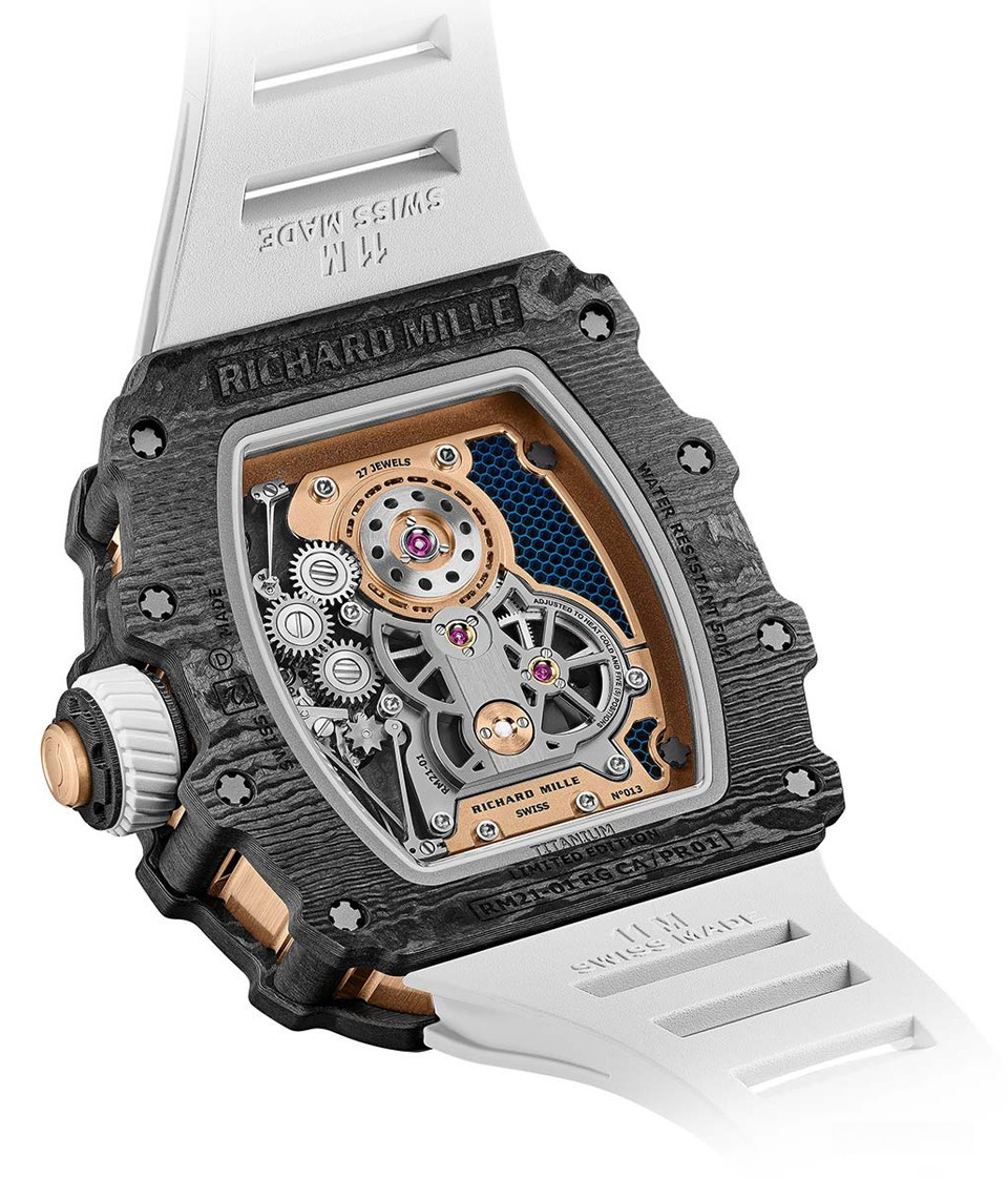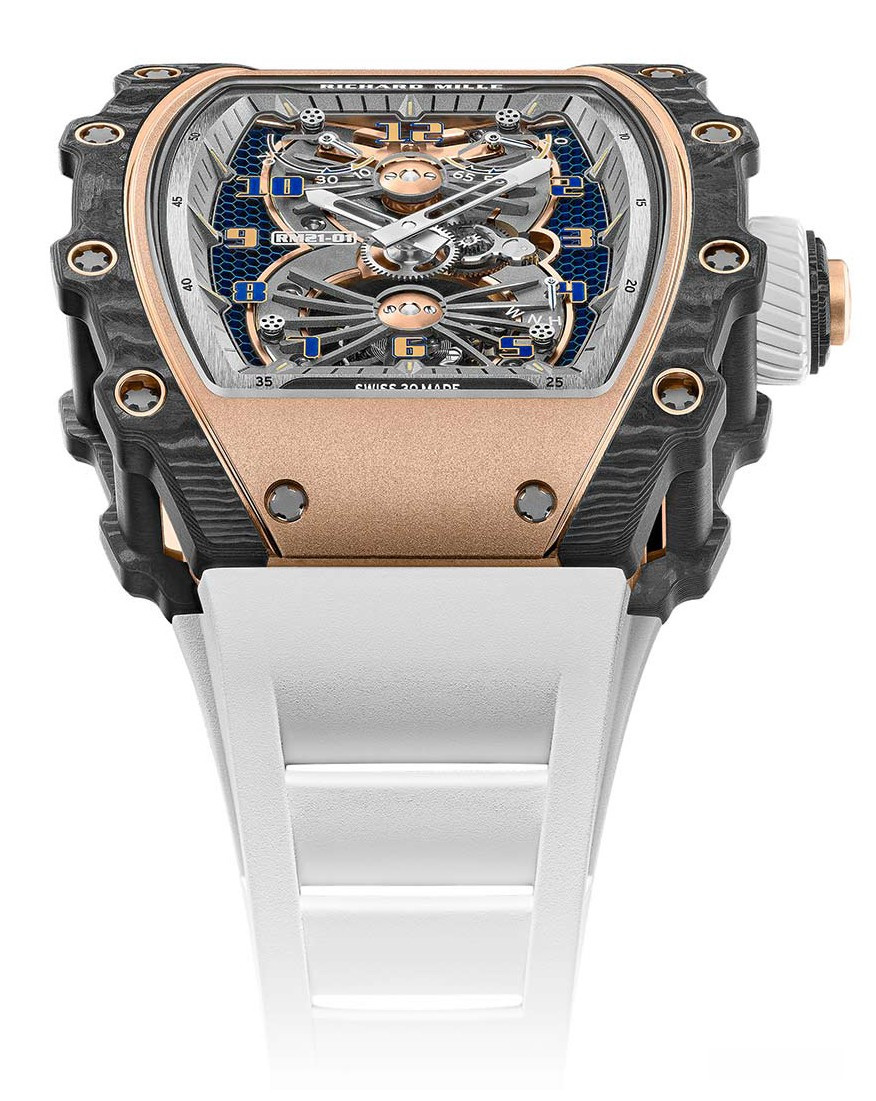 Часы Richard Mille RM 21-01 Tourbillon Aerodyne представлены в корпусе из розового золота 18к и карбона ТРТ размером 42.68 x 50.12 x 14.3 мм водонепроницаемостью 50 метров. Внутри корпуса находится механизм с ручным заводом, Калибр RM 21-01, обладающий запасом хода 72 часов. На сером циферблате отображаются часы, минуты, запас хода, индикатор крутящего момента. Часы поставляются на каучуковом ремешке с титановой вставкой. Серия ограничена - 50 шт.